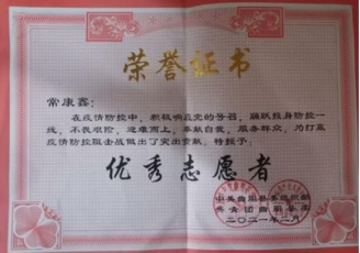 面对严峻的防疫形势,我校学生常康鑫积极响应曲周县当地政府号召参与疫情防控志愿服务,迅速投入防疫战役当中,与志愿者们一起以自身绵薄之力保障社区安全,为打赢地区疫情防控阻击战作出努力。因工作努力,贡献突出,常康鑫同学获河北省曲周县组织部颁发的“优秀志愿者”荣誉称号,这既彰显了当代合师青年勇于承担社会责任的学子情怀,又践行着新时代大学生自强不息有所作为的青春风采。