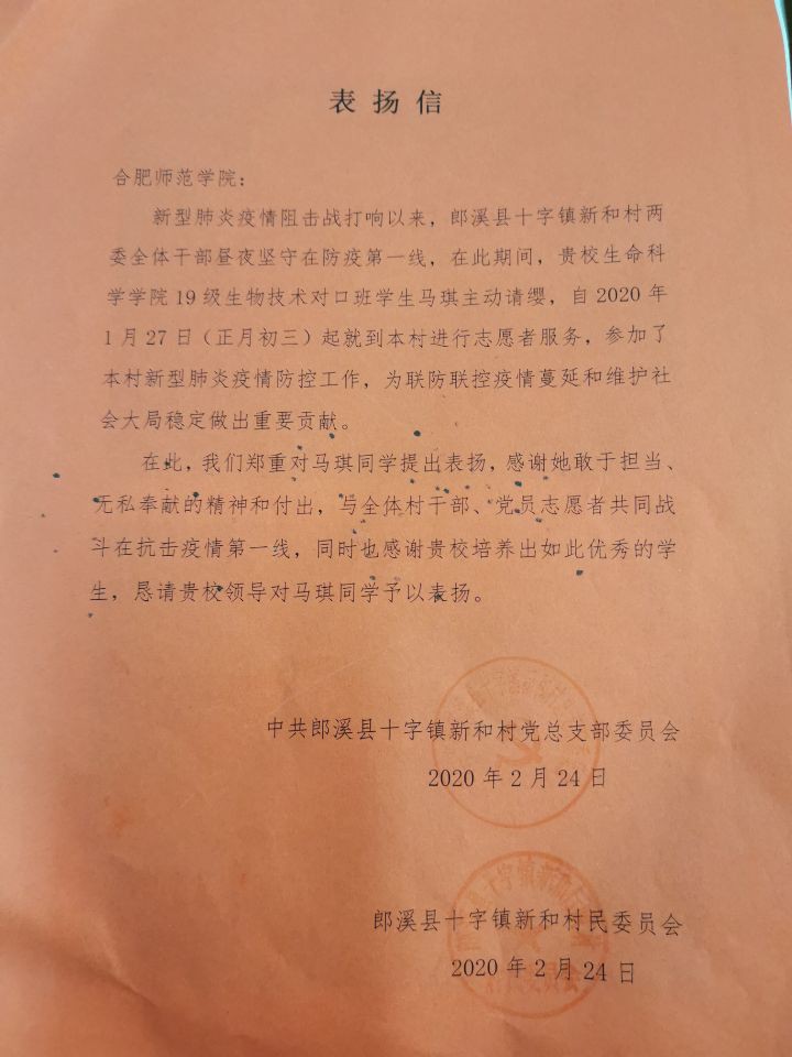 为了感谢马琪同学为抗击和维稳疫情的贡献,郎溪县十字镇新和村党总支部委员会特地向学校邮寄来对马琪同学的感谢信。这封信不仅是对马琪同学单纯的表扬,更是对我们学校能够培养如此优秀同学的认可。