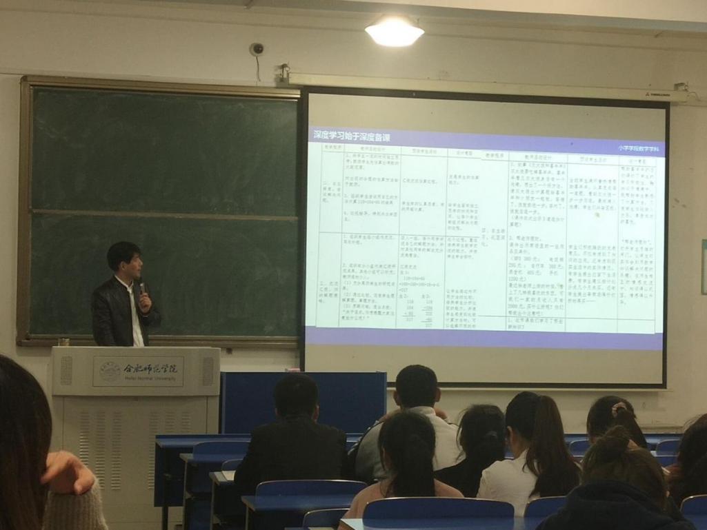 合肥师范附小徐晓伟老师进行了“深读学习始于深度备课”为主题的教育培训。他以小学数学学科中的计算课、概念课、复习课为例,为同学们剖析了“深度备课”的概念,详细举例说明了:如何提高学科的趣味性,增强生活性,增加学生的参与度,打造创新性课堂,注重学生的个性化发展等问题,并为同学们明确在备课时要达到的目标,指出常见的误区,为同学们提供了高效深度备课的思路和方法。