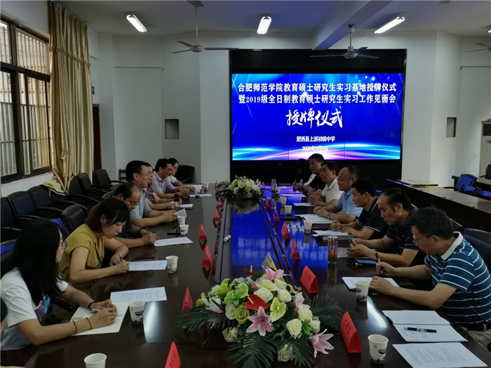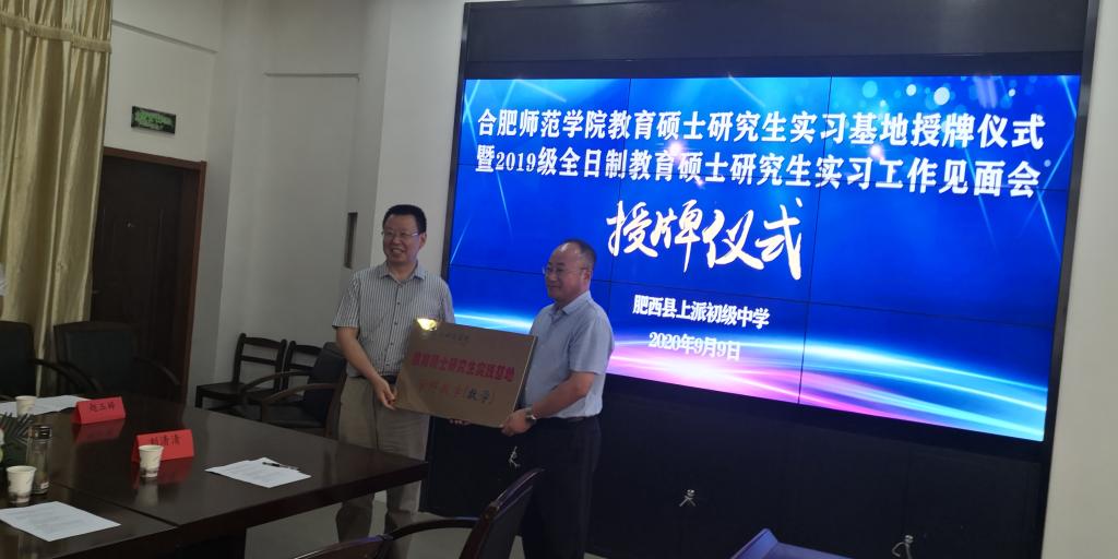 本网讯 9月9日上午9点,beat365唯一官方网站学科教学(数学)专业硕士研究生实习基地授牌仪式暨2019级全日制研究生实习工作见面会在肥西县上派初级中学2号会议室顺利召开。beat365唯一官方网站副校长曹卓良、研究生处处长胡玉娟、肥西县上派初级中学校长及党委书记周宁、副校长解光文、教务处主任张世勇、研究生校外导师卫德彬、实习指导教师刘清清、丁增宝、解正兵、孙业勤、beat365唯一官方网站数学与统计学院院长王家正、带队教师万家练以及2019级芦琳琳等5位研究生出席并见证了授牌仪式。活动由beat365唯一官方网站数学与统计学院院长王家正主持。