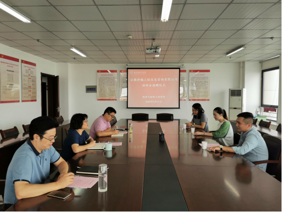 本网讯 9月11日下午,物理与材料工程学院与安徽梓翰信息工程咨询有限公司举行梓翰助学金捐赠仪式。安徽梓翰工程信息咨询有限公司总经理胡毅一行,物材学院党总支书记唐洁、副院长李大创和相关老师参加捐赠仪式。仪式由党总支副书记吴震主持。