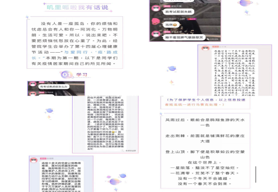 本次活动旨在提高学生心理健康水平和心理素质,引导学生树立理性平和、积极向上的健康心态。由于疫情原因,同学们长期居家,免不了有一些烦恼困扰无法倾诉。此次活动为同学们提供了一个倾诉心声的平台,同学们在这里分享自己的快乐与烦恼,倾诉着生活中的点点滴滴,大家在这里安静聆听,或帮忙同学解决烦恼。同学们热情饱满,积极参与,本次活动取得了圆满成功。