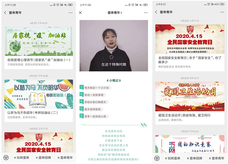 良好校园风尚能够温润心灵、引人向善,促进校园和谐运转。4月初开始,学院开展了线上读书教育活动,同学们依据老师们的推荐书目同读书、抒感想。与此同时,学院微信公众号推送了“健康宅家”系列推文,优秀团干代表通过小视频形式与学院青年们分享如何培养健康的宅家作息,培养自律、阳光的生活品质。除此之外,公众号还推送了《全民国家安全教育日》、《爱国卫生活动月》等系列推文,引导青年学生树立正确的国家安全观、积极参与爱国卫生运动。通过有深度、有温度、有意思的各种精神文明创建活动,助推学院青年学生的归属感、获得感、幸福感、安全感更加充实、更有保障、更可持续。