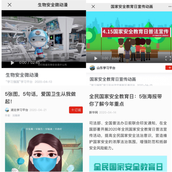 活动中,同学们充分利用“学习强国”学习平台资源,认真先后学习了《5张图、5句话,爱国卫生从我做起》、《全民国家安全教育日:5张海报带你了解今年重点》等宣传海报以及《生物安全微动漫》、《国家安全教育日宣传动画》等视频资料,并将学习的科普视频、宣传海报等在学习交流群内共享,增长了专业知识,激发了同学们的爱国热情。