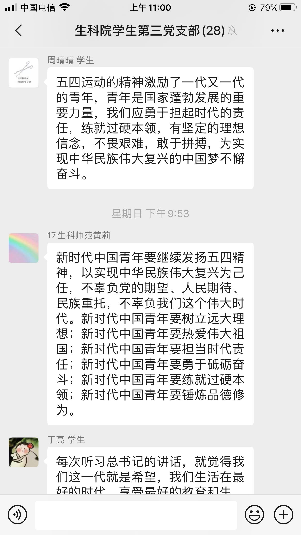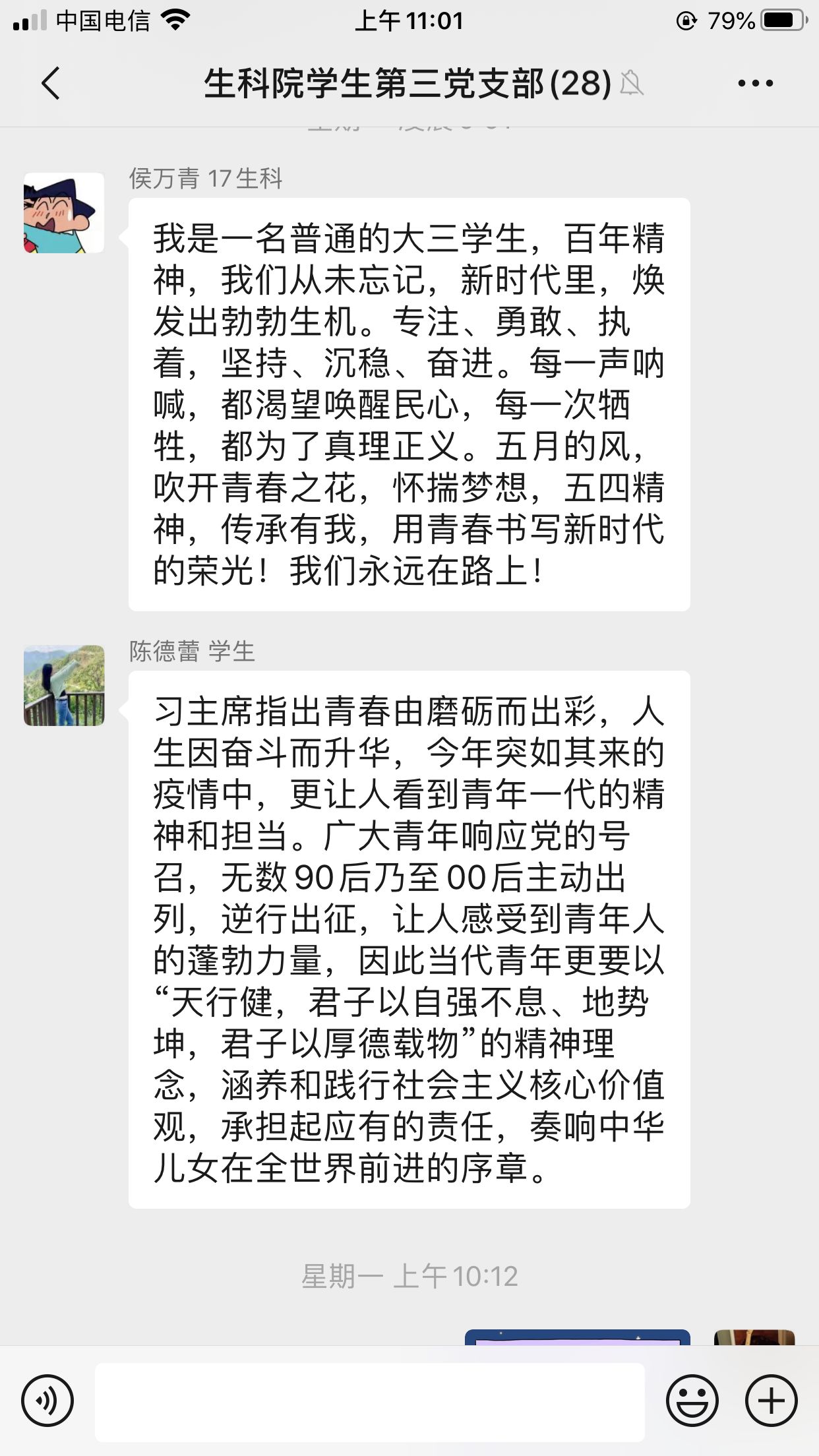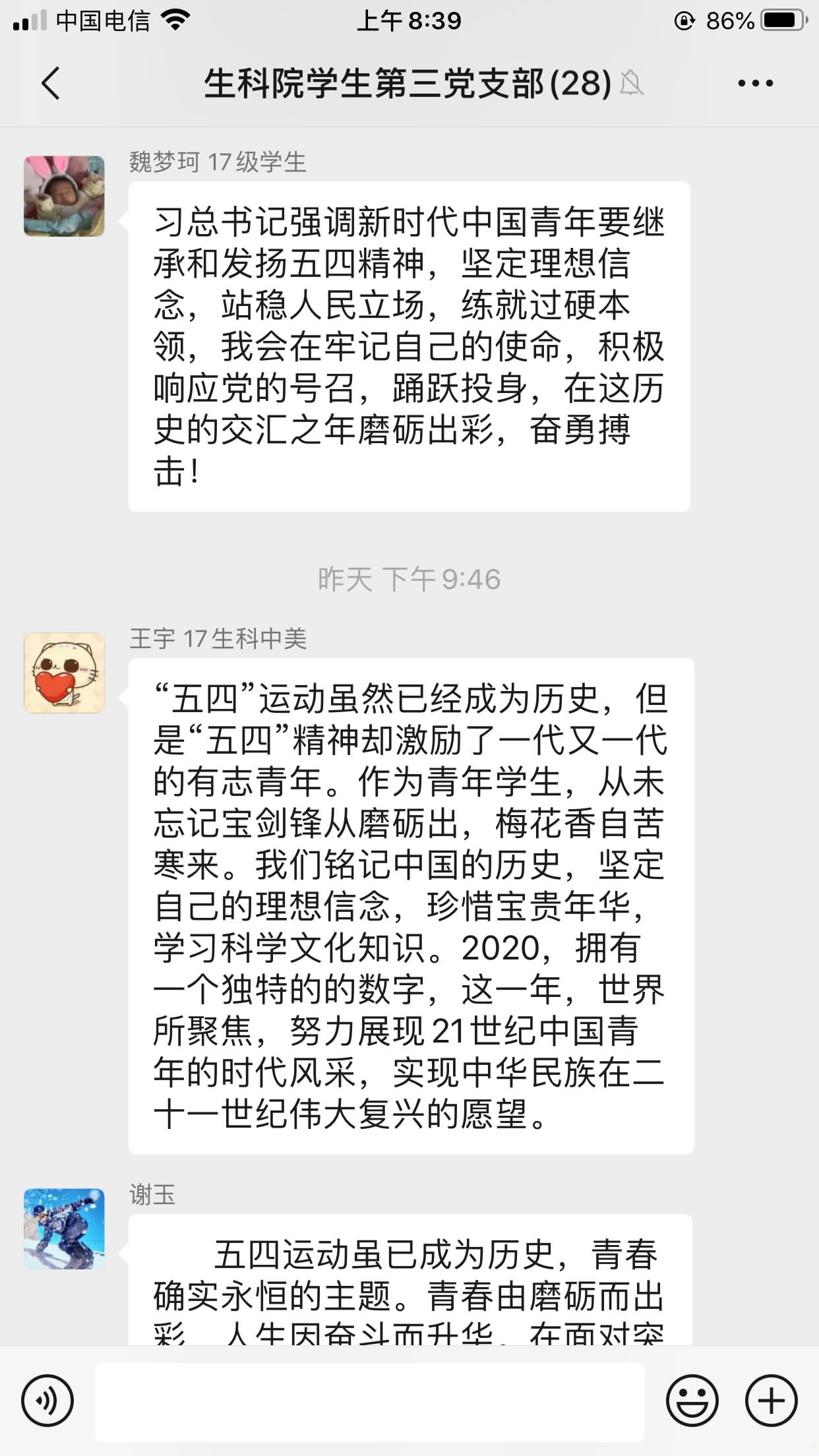 本网讯 又一个五四青年节来临,今年是五四运动爆发101周年的日子,也是全国疫情防控阻击战取得重大战略成果背景下的青年节。为缅怀历史,学习和弘扬“五四”精神,在五四青年节到来之际,生命科学学院学生第三党支部于5月3日在线上开展“五四精神,传承有我”主题党日活动。本次活动由学生第三党支部书记李万成主持。