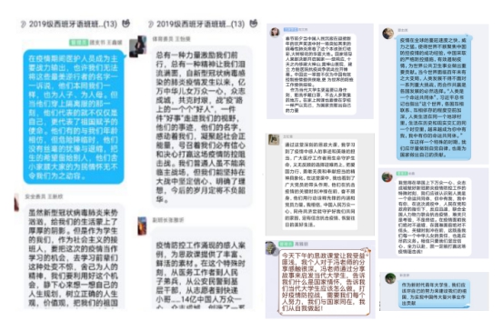 2019级西班牙语班宣传委员刘可可说:“我被安徽医疗队的事迹深深感动。他们在年关将近时毅然舍小家,顾大局,连夜赶到湖北疫区,冲锋上阵;他们不顾自身的疲惫,昼夜奋战,与死神争夺危重症病人的生命。他们的身体被高强度的工作和防护设备留下了痕迹,而他们可贵的精神品质同样也留在了这场没有硝烟的战争中,留在了我的心里。”