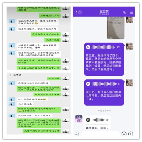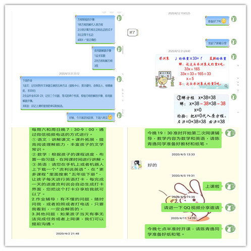 小先生们根据小学员们的实际情况,协调相关辅导时间,采取了微信文字、语音、电话等在线方式,以检查作业、讲解错题、课外专题辅导为主要内容,每天定时和小学员们交流沟通。此外,家长也提供了大力的支持和必要的帮助。