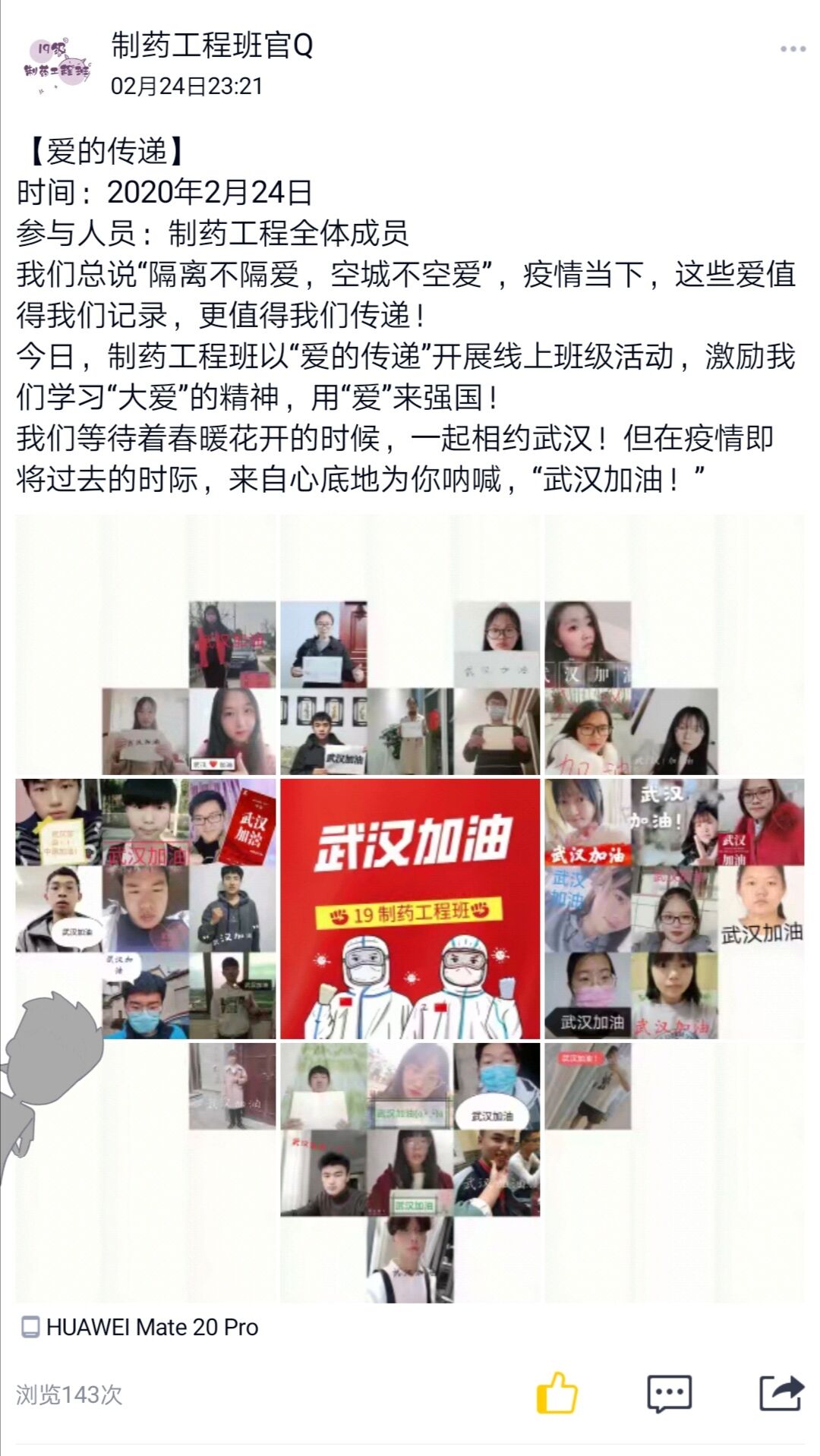 化学与化学工程学院组织开展“防控疫情,我是合师学子我承诺”“愿山河无恙,人间皆安”“爱的传递”等系列主题活动。在活动中,同学们承诺科学防控,不出门不造谣。在活动中,同学们通过“云”照片,分享在家心得,感受着平凡至极的美好;在活动中,同学们录制视频,把心里的温暖和最殷切的劝导分享给大家;在活动中,师生们开启“云”祝福,真诚地为武汉加油,静待疫情过去,春暖花开。(化学与化学工程学院:原嘉清、刘哲)