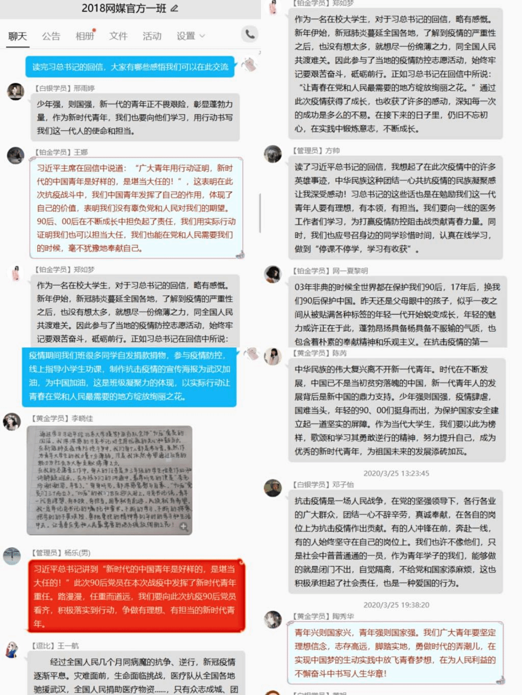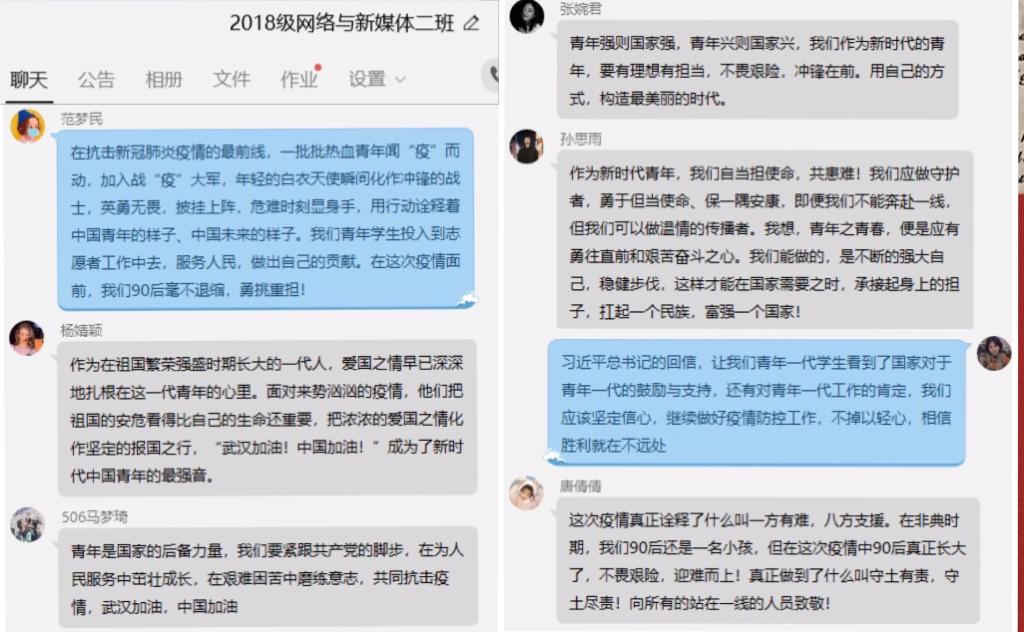 2018级网络与新媒体一班团支部通过开展线上主题班会的形式,组织参与基层社区抗疫志愿服务的王娜、夏黎明、郑如梦、杨乐、郭子菀等同学一一与同学们分享了疫情期间自己的志愿服务经历,交流了心得体会。“‘00后’的我们也在迎难而上,让青春在党和人民最需要的地方绽放绚丽之光。”一班的李晓佳同学用笔写下感想,也写下了我们的责任和前进方向。