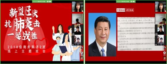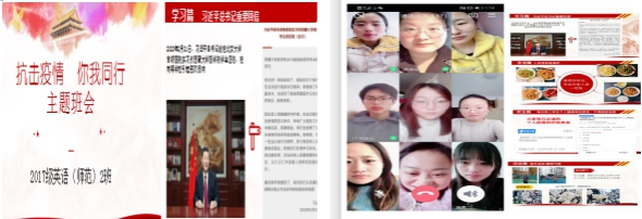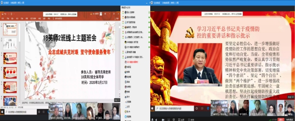 本网讯 为深入学习贯彻习近平总书记关于新冠肺炎疫情防控的重要讲话精神,进一步激发广大青年学子的责任担当,深入推进爱国主义教育,引导其为助力国家、社会和学校打赢疫情防控阻击战贡献青春力量。外国语学院各班积极响应号召,利用线上“云”平台开展“众志成城共克时艰 坚守使命服务青年”的主题班会。