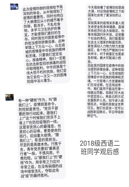 2016级英语(翻译)班党员孙许缘同学说,“看了这堂课,令我受益匪浅,我对中国抗击疫情的担当感到骄傲和自豪,对新冠病毒也有相当的认识,作为一名新时代大学生,我们要通过这场战疫更加坚定自己的使命和担当。”