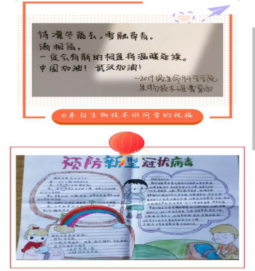 大灾面前有大爱,岁月静好中是因为有人为我们挡风遮雨、负重前行,而上不了“前线”的青年学子,只能在后方坚守阵地,默默为他们加油,为他们祝福!防控疫情阻击战,是一场人民的战争,也是一场心理战役,一线的“战士”争分夺秒与病魔战斗,同时间赛跑。后方,生科院学生会在学院党委的领导下、分团委的指导下组织广大青年学生开展线上战“疫”活动:普及新冠肺炎知识,宣传防疫措施,给一线“战士”手写祝福语,发表疫情期间感想等。上下同欲者胜,同舟共济者赢。生科院组织各个班级征集防疫艺术作品,希望同学们以关爱之心,以微薄之力与社会各界一同抗疫,共克时艰。通过作品的形式,把爱心持续传递下去,把防疫思想宣传出去。此外,同学们还自觉说服自己的家长和乡亲们做好防控工作,向他们讲解防疫知识,让身边人重视起来、行动起来。