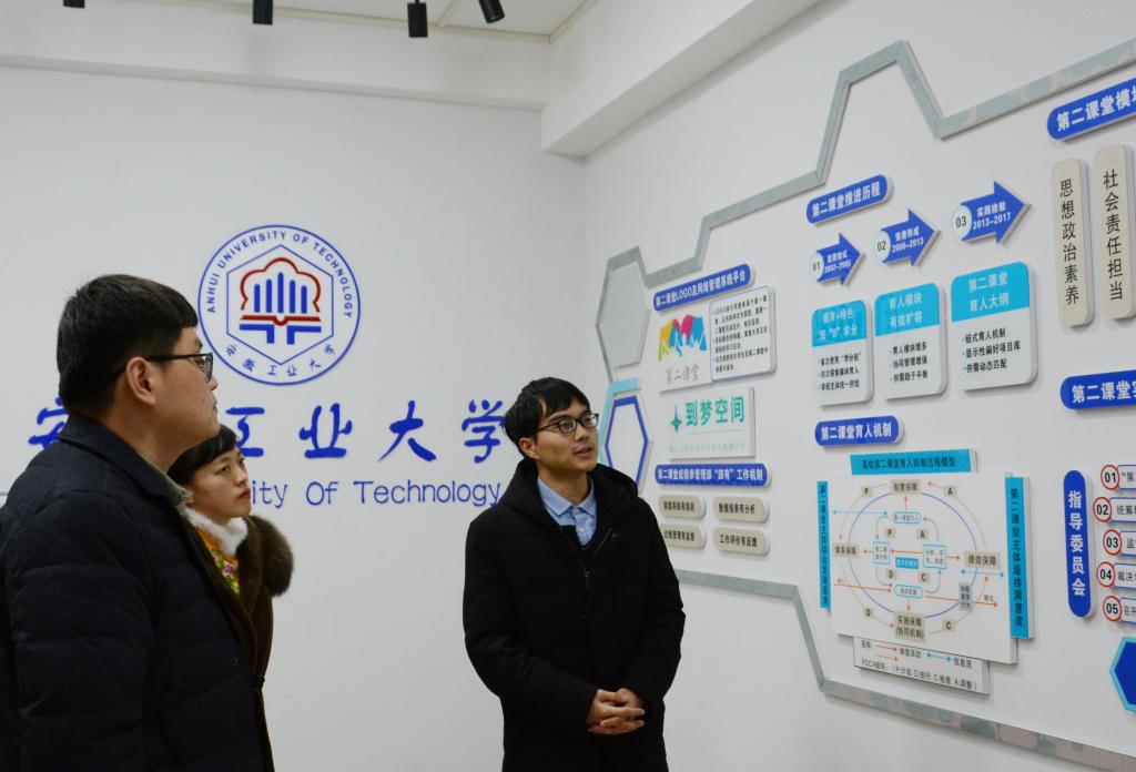 1月6日,院团委一行在安徽工业大学学习调研。安徽工业大学团委副书记王菁介绍了安徽工业大学共青团基本情况。该校团委及学院团委负责同志分别以PPT的形式,围绕“第二课堂”成绩单制度实施、“挑战杯”赛事筹备等主题介绍典型做法。双方还就青年志愿服务、学生社团管理、团属新媒体建设等进行了交流。院团委全体人员还实地参观了安徽工业大学“第二课堂”活动中心。