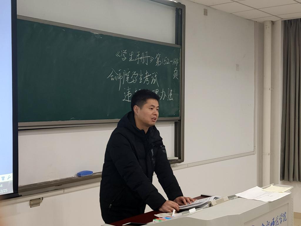 临近学期末,期末考试即将来临,学院各班辅导员(班主任)先后深入锦绣和滨湖两个校区的班级,召开诚信考试教育主题班会,在班会中宣讲诚信考试的有关内容,强化各年级学生的诚信意识,严肃考风考纪,希望同学们在面对期末考试,积极备考,强化“自律”意识,扎实开展术科训练、理论课复习,在期末考试中取得良好的成绩,以考促学、以考促训。(体育科学学院)