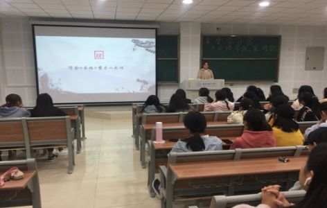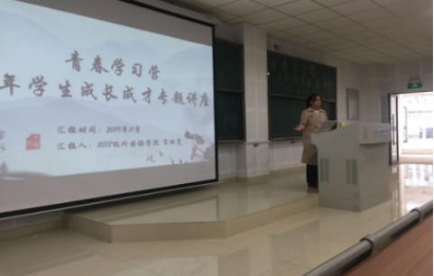 本网讯 为了让大一新生对大学生活有更充分的了解,帮助新生树立正确的目标,外国语学院2017级英语(师范)3班的宋丽雯同学于11月16日下午在滨湖校区博学楼A108以“在青春学习营里的所学所知”为主题展开了系列经验分享活动。全体2019级外国语学院新生参与本次活动。
