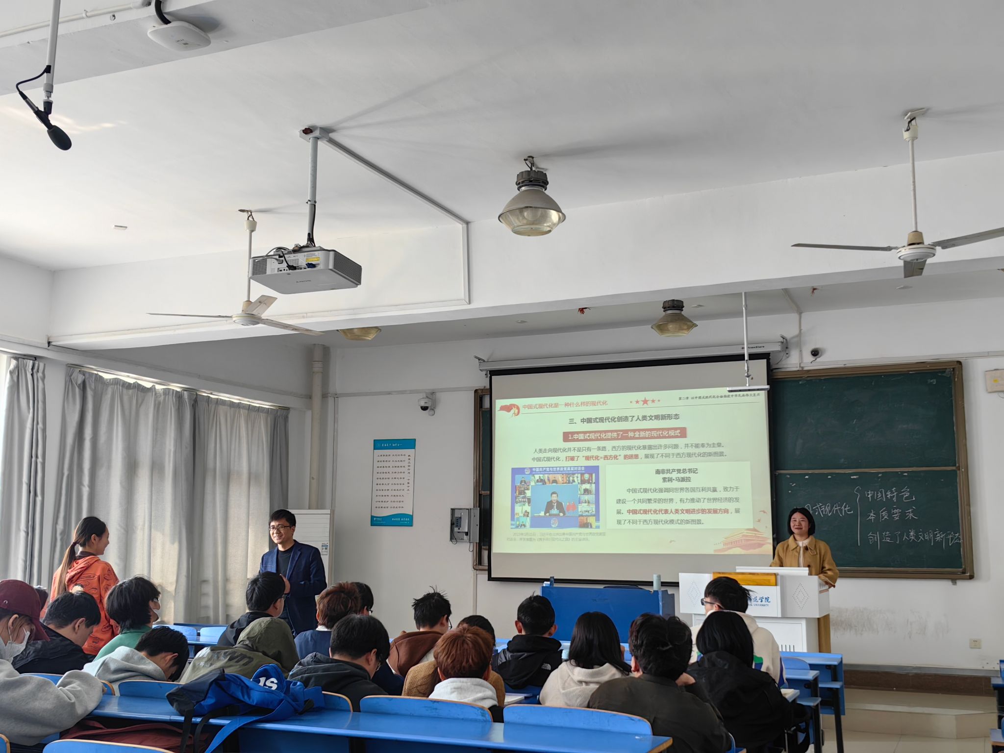 在逸夫楼A406教室,首先由教师蒋娟以问题式导入本节专题“中国式现代化是强国建设和民族复兴的唯一正确道路”。蒋娟以学生为主体,以问题为导向,通过问题链分析阐释中国式现代化的中国特色和本质要求。她以视频方式引入“为什么说中国式现代化创造了人类文明新形态?”随后,教研室主任张军占从人类文明新形态的内涵,人类文明新形态“新”在哪里?运用对比的方式,分析中国式现代化是一种全新的现代化模式、是对西方式现代化理论与实践的重大超越、是人类现代化道路的全新选择。