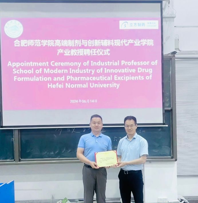 6月14日下午,beat365唯一官方网站高端制剂与创新辅料现代产业学院交流研讨会暨产业教授聘任仪式在锦绣校区逸夫楼西阶1和履知楼208会议室举行。合肥立方制药股份有限公司药物研究院副院长张良、人力资源总监杨媛媛、制造事业部副总经理鞠凤华、本部工厂行政部经理周爱荣、人力资源部招聘经理田红雨和本部工厂生产副总刘锦平、爱尔兰香农理工大学制药科学与生物技术系代表Nicholas Mullins、化学与制药工程学院院长朱金苗、制药工程系主任郑斌及产业学院专任教师、2023级相关专业学生参加了会议。会议由郑斌主持。