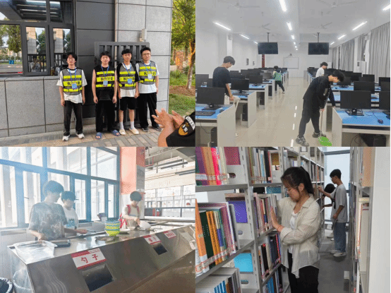 此次劳动教育实践将教室卫生、宿舍卫生和家庭卫生等日常劳动常态化、制度化,学院要求各班级制定了教室、宿舍值日表,每周、每日进行卫生清洁,确保教室、宿舍的日常整洁。学院每月安排学生组织进行卫生安全检查,督促学生在日常中保持良好的学习、生活环境。除日常的实践劳动外,学院还在劳动实践周开展了实验室打扫、食堂劳动、图书馆劳动、安全保卫劳动等多项校园劳动,各班级分批次有序开展。首先,学生们对学院机房实验室进行轮流排班打扫,使得实验室始终保持干净整洁,焕然一新。在图书馆劳动中,学生们在工作人员的指导和安排下,打扫图书室卫生,将图书归还原位,排列整齐,为借阅者提供了方便快捷的阅读环境。在安全保卫劳动中,学生们化作校园保卫者,进行校园安全巡逻,在校园出入口核查把关,维护校园安全稳定。在食堂劳动中,学生们擦桌扫地,收拾碗盘,维持食堂就餐秩序,为广大师生营造了良好的用餐环境。