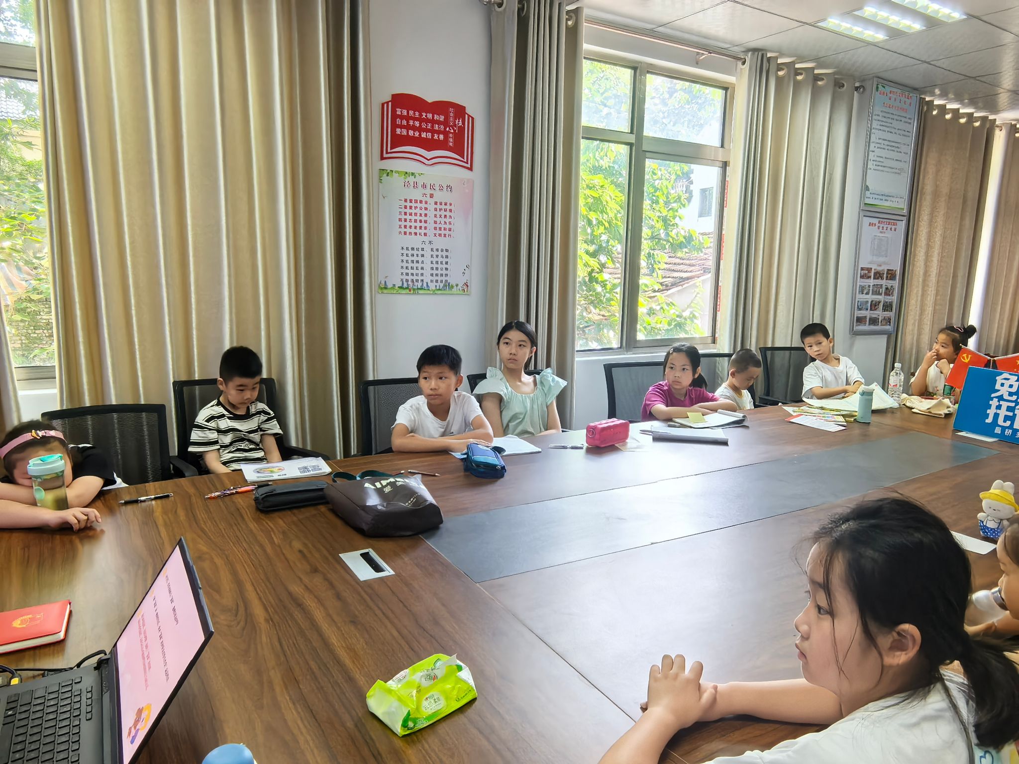 7月18日上午,院团委泾县昌桥乡行知学堂的“小先生”们为缓解小学员们成长过程中遇到的各种压力和挫折,同时也为了让小学员感受换位思考和理解彼此情绪的重要性,体悟对彼此的理解是化解负面情绪的良药这一道理。“小先生”刘乙磊以拥抱“暴暴”为主题,通过课件、音频、颜料、“暴暴”的故事、“暴暴”毛绒玩偶、爱心便利贴等载体,开展了本次心理健康教育课。