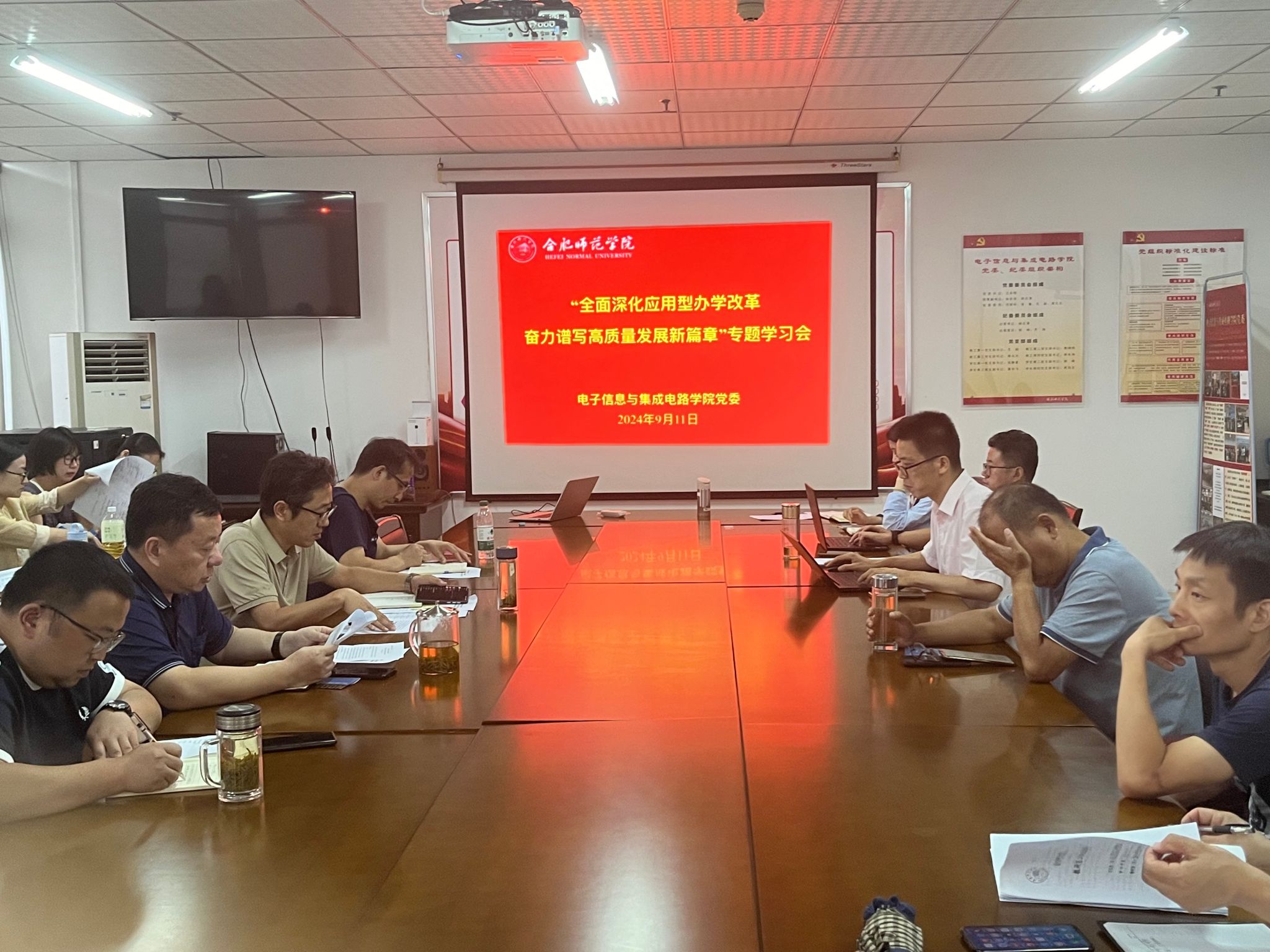 为深入学习贯彻习近平总书记关于教育的重要论述,引导广大教师弘扬践行教育家精神,为校院高质量发展贡献力量。9月11日下午,电子信息与集成电路学院党委在知行楼1210会议室召开“全面深化应用型办学改革 奋力谱写高质量发展新篇章”专题学习会议,院党委书记王东明,党委副书记、院长张忠祥,党委副书记、纪委书记胡石清,党委委员、副院长范程华及全体教职工参会,会议由张忠祥主持。