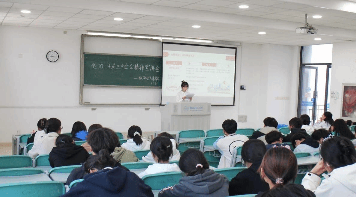 为深入学习宣传贯彻党的二十大和二十届三中全会精神, 11月6日,数学与统计学院在滨湖校区博学楼C201开展了党的二十届三中全会精神青年学生宣讲会,会议邀请了校第四届青年学生宣讲团成员李康焱宣讲。共青团数学与统计学院委员会、数学与统计学院学生会、团支部等滨湖校区成员及共青团员,近120余人参会。