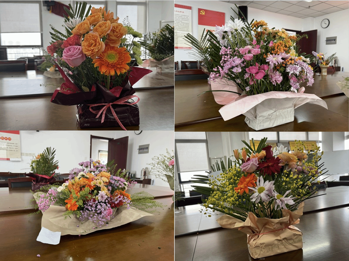 此次活动吸引了众多女教工的热情参与,共计30余名女教师参加了比赛。活动现场,花团锦簇、香气四溢,气氛热烈而温馨。分配好插花材料后,各组老师分工明确,纷纷拿起花枝动手修剪,巧妙搭配,一朵朵鲜花在她们的巧手下变得错落有致,成为一件件清新怡人的精美花艺作品。
