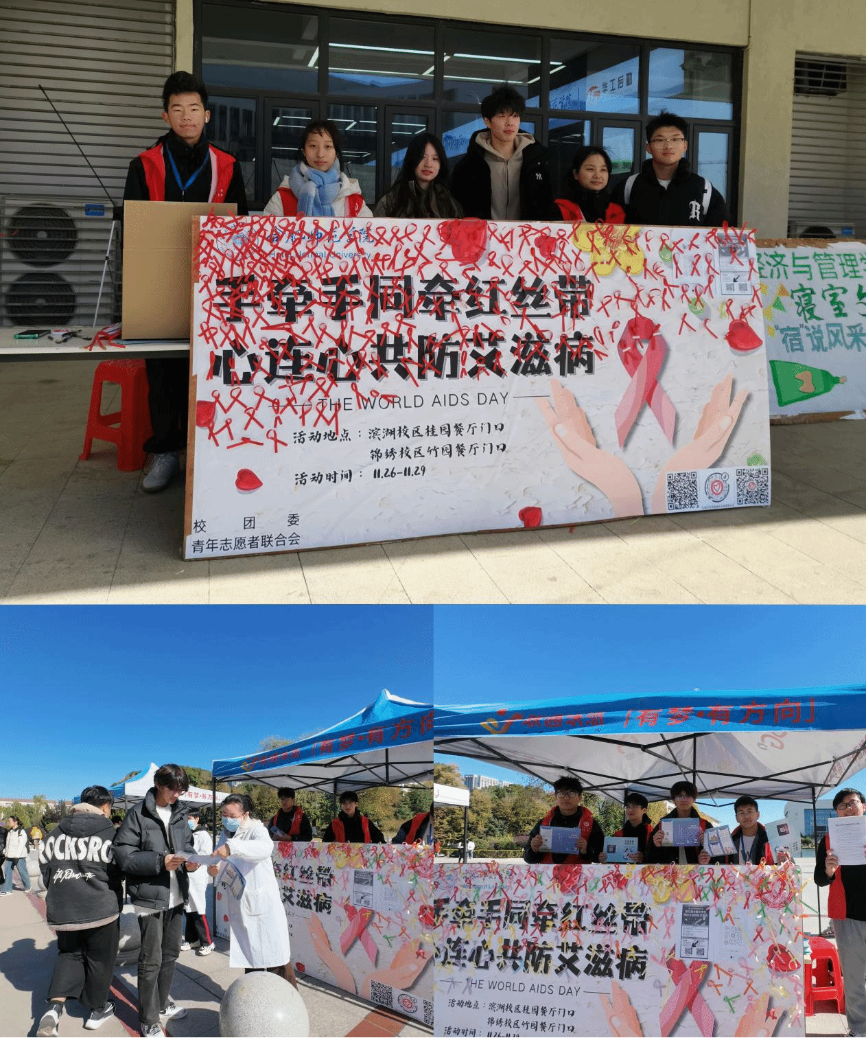 11月23至25日,后勤处校医院联合团委青年志愿者联合会分别在锦绣、滨湖校区校园广场开展艾滋病宣传活动。志愿者联合会的同学们绘制艾滋病主题展板,向同学们发放了艾滋病宣传单页约3000份。