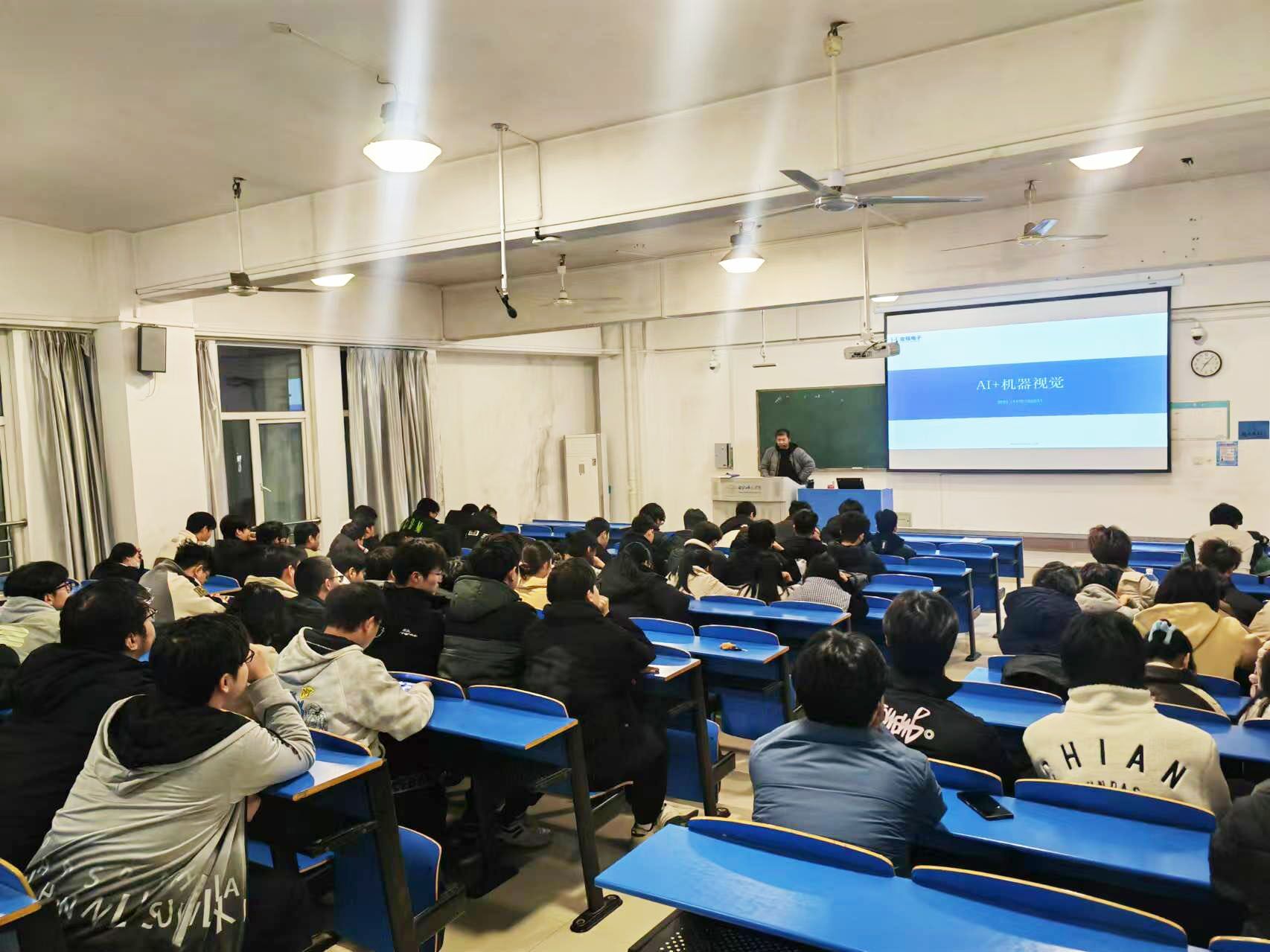 讲座现场气氛热烈,学生表现出对此次讲座的高度热情和浓厚兴趣。钟钊通过生动的案例和深入浅出的讲解,详细介绍了AI和机器视觉在现代科技领域中的重要应用,包括工业自动化、医疗影像分析、智能安防监控等方面。讲座过程中,钟钊还展示了大量实际项目中的数据和图片,使抽象的理论知识变得直观易懂,同学们全神贯注地聆听,不时记录下重点内容。