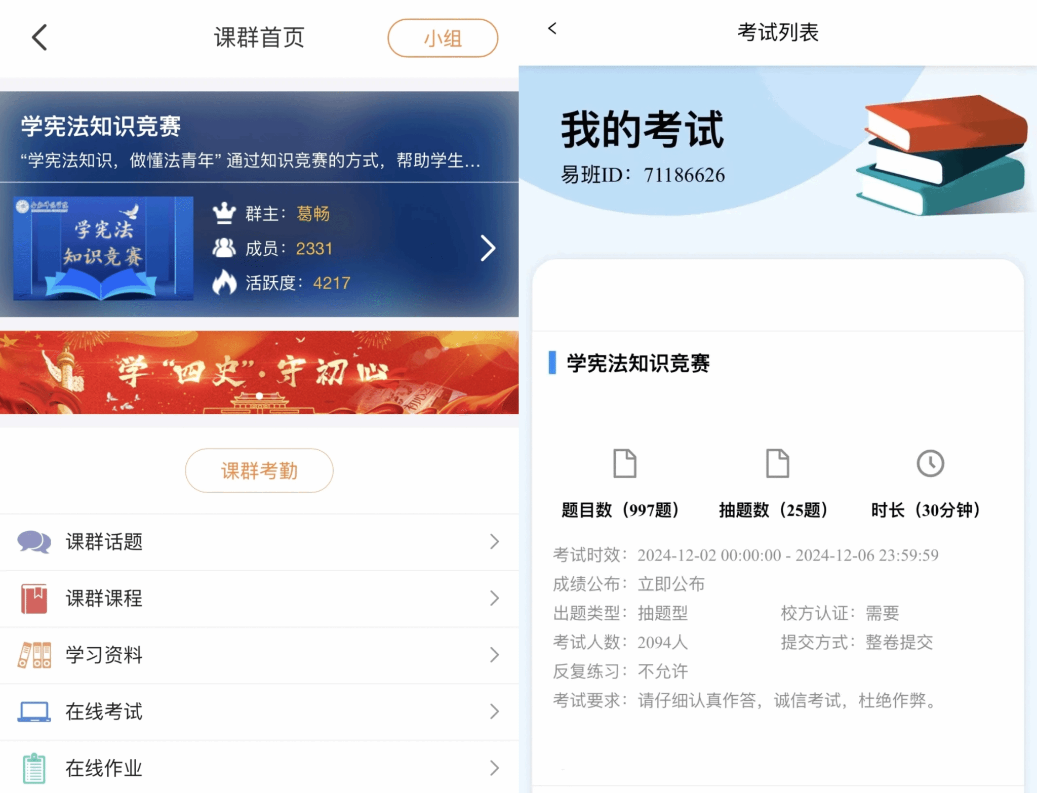 为迎接12月4日中国“宪法日”,增强合师学子的法治意识和法治素养,学院于2024年12月2日至6日开展了学宪法知识竞赛。