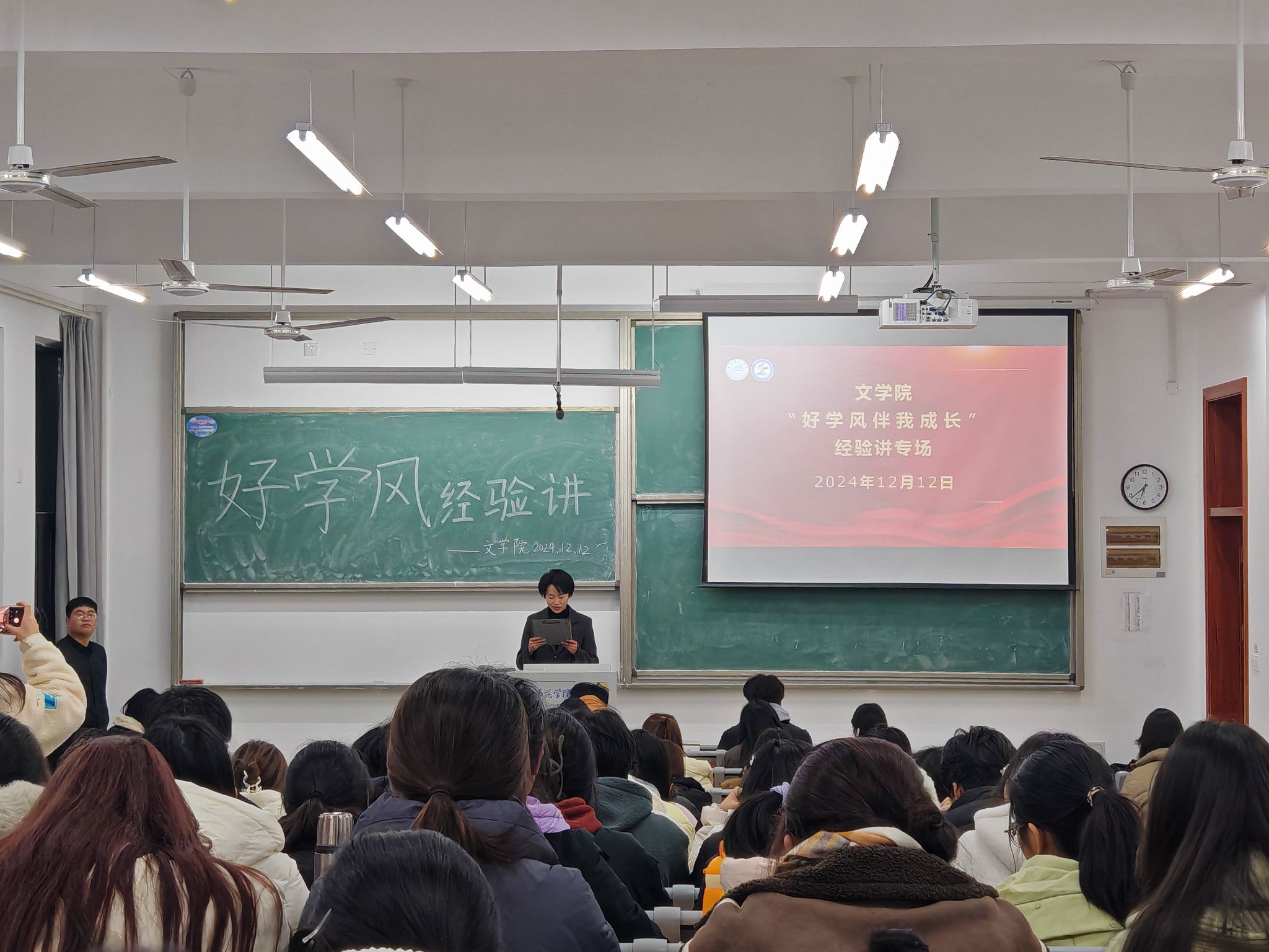 为创建优良学风,通过让“身边人讲身边事”,发挥朋辈育人作用,帮助2024级学生找准学习成长的主方向,引导学生在学科与技能竞赛、创新创业、职业规划、社会实践等方面积极锻炼自我,努力提升个人综合素质,12月11-12日,文学院在滨湖校区铭传楼举办“好学风经验讲”活动。活动邀请电子信息与集成电路学院学生王晶晶;文学院学生、安徽省“自强之星”获得者张六军、全国职业技能大赛二等奖获得者王炜彬、学校示范行知学堂团队负责人余燕作为宣讲人,分享个人先进事迹和心得体会。文学院2024级学生约300余人聆听了宣讲会。