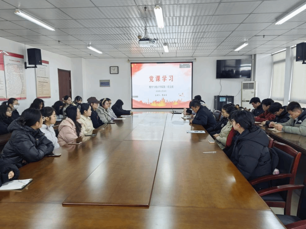 12月24日中午,数学与统计学院学生第二党支部在锦绣校区行知楼1102会议室开展了支部主题党日暨党课活动。学院党委副书记陶金昌、支部书记周丽娜、支部全体党员和入党积极分子参加了本次活动。活动由支部书记周丽娜主持。