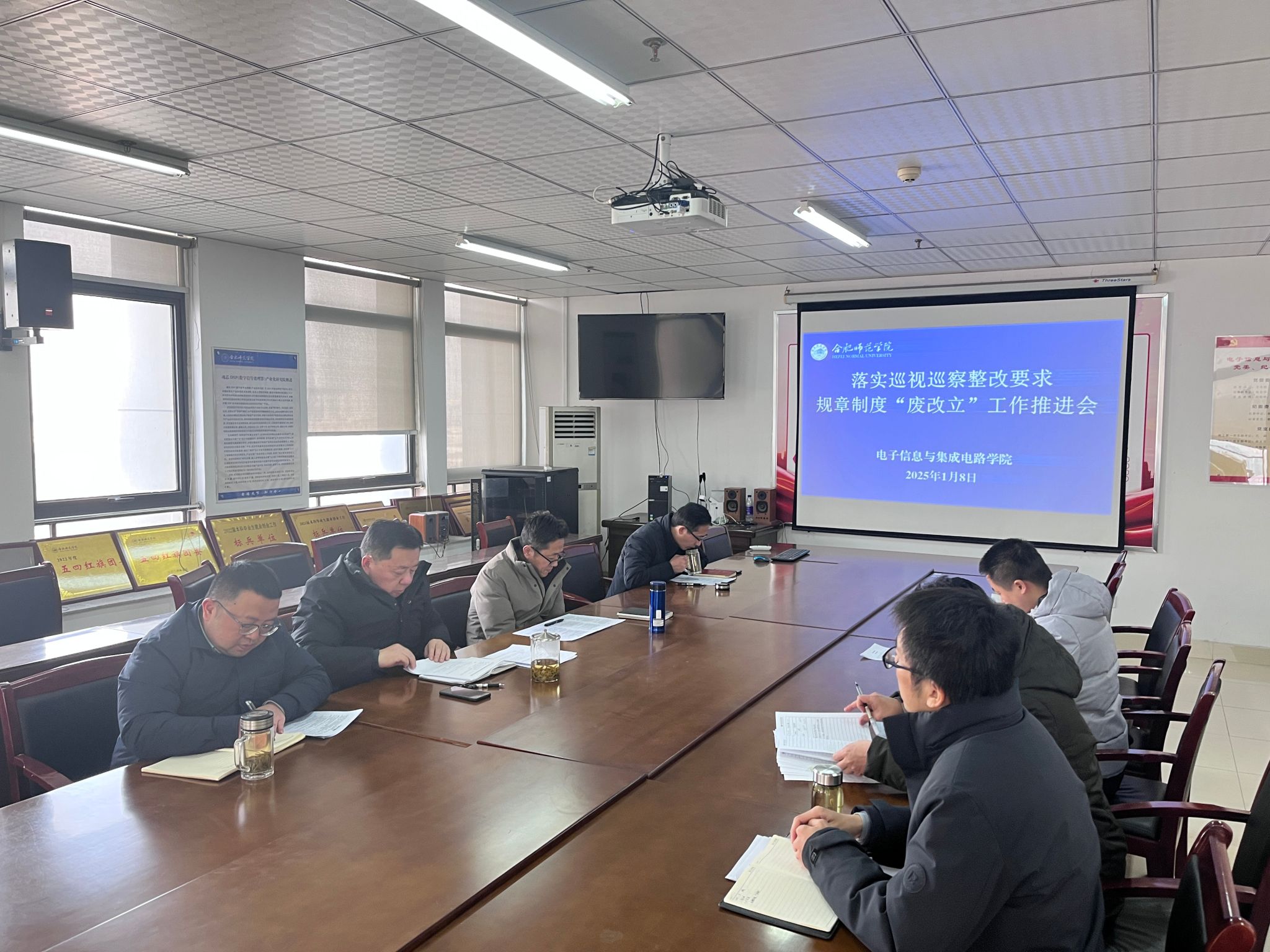 为进一步落实巡视巡察整改要求,推进学院治理体系规范化、科学化建设,1月8日下午,电子信息与集成电路学院在行知楼1210会议室召开党委会和党政联席会议,研究布置推进规章制度“废立改”等工作。学院党政班子全体成员参加会议,会议由党委书记王东明主持。