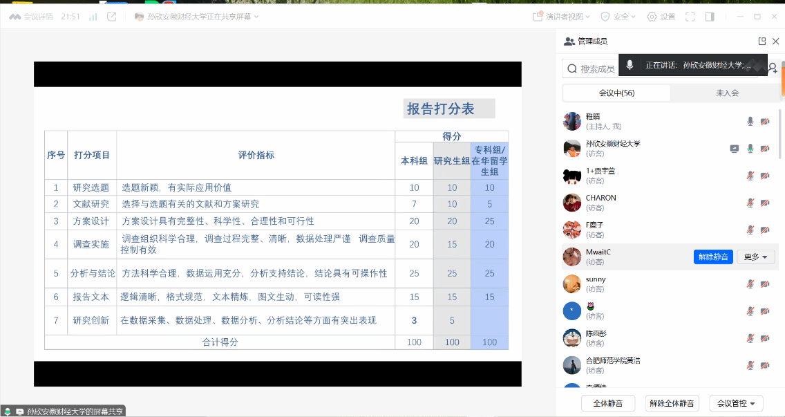 为提升学生在 “正大杯” 全国大学生市场调查与分析大赛中的竞争力,2月28日晚,应数学与统计学院邀请,安徽财经大学统计与应用数学学院孙欣教授为大赛指导教师和参赛学生作了关于第十五届市场调查与分析大赛线上专题讲座,讲座主题为“正大杯”全国大学生市场调查与分析大赛评分标准解读及经验分享。学院副院长黄浩,所有指导教师和参赛学生团队队长参加了讲座。讲座由黄浩主持。