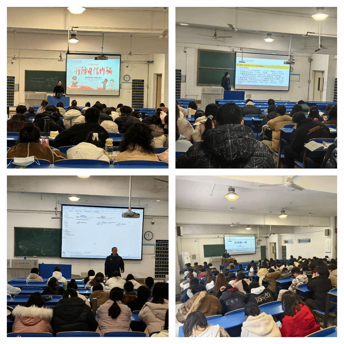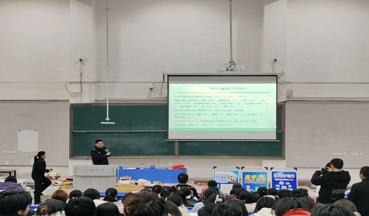 防诈安全专题宣传筑牢防火墙。开学以来,辅导员在各班级均开展了一次反诈专题宣传,做到了反诈安全工作全覆盖。3月6日下午,特邀合肥市公安局锦绣派出所警官李玉成在锦绣校区逸夫楼西阶教室开展“防范电信诈骗”专题讲座,讲座由辅导员徐浩然主持,全体辅导员和200余名学生聆听了讲座。李玉成警官结合辖区发生的真实诈骗案例,通过剖析网络刷单等常见的诈骗手段,详细介绍了电信网络诈骗的基本类型和防范手段,揭露了诈骗分子惯用的作案伎俩,让同学们对电信网络诈骗的各种圈套有了更加清晰的认识,进一步提高了同学们对各类电信网络诈骗的鉴别力和反诈能力。
