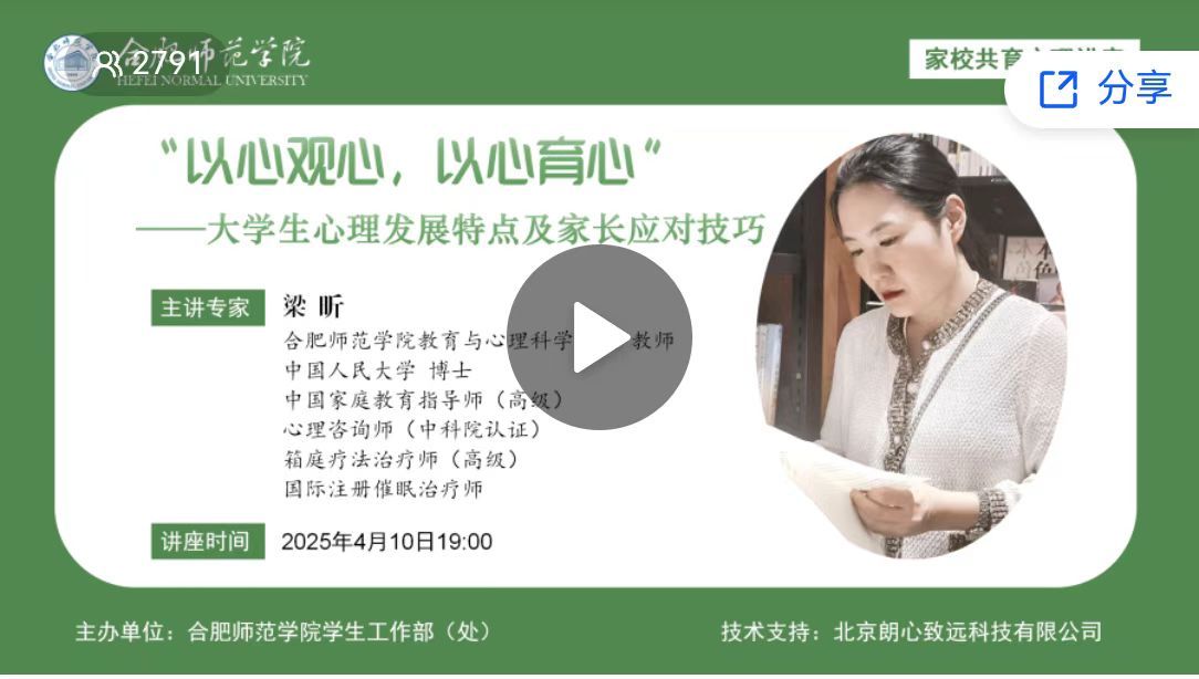 为发挥家校心理育人合力,共同营造学生健康成长的良好环境,学院组织开展主题为“以心观心、以心育心——大学生心理发展特点和家长应对技巧”家校共育线上心理讲堂。本次讲座由教育与科学学院教师梁昕主讲,在校学生及学生家长参与观看近3000人次。