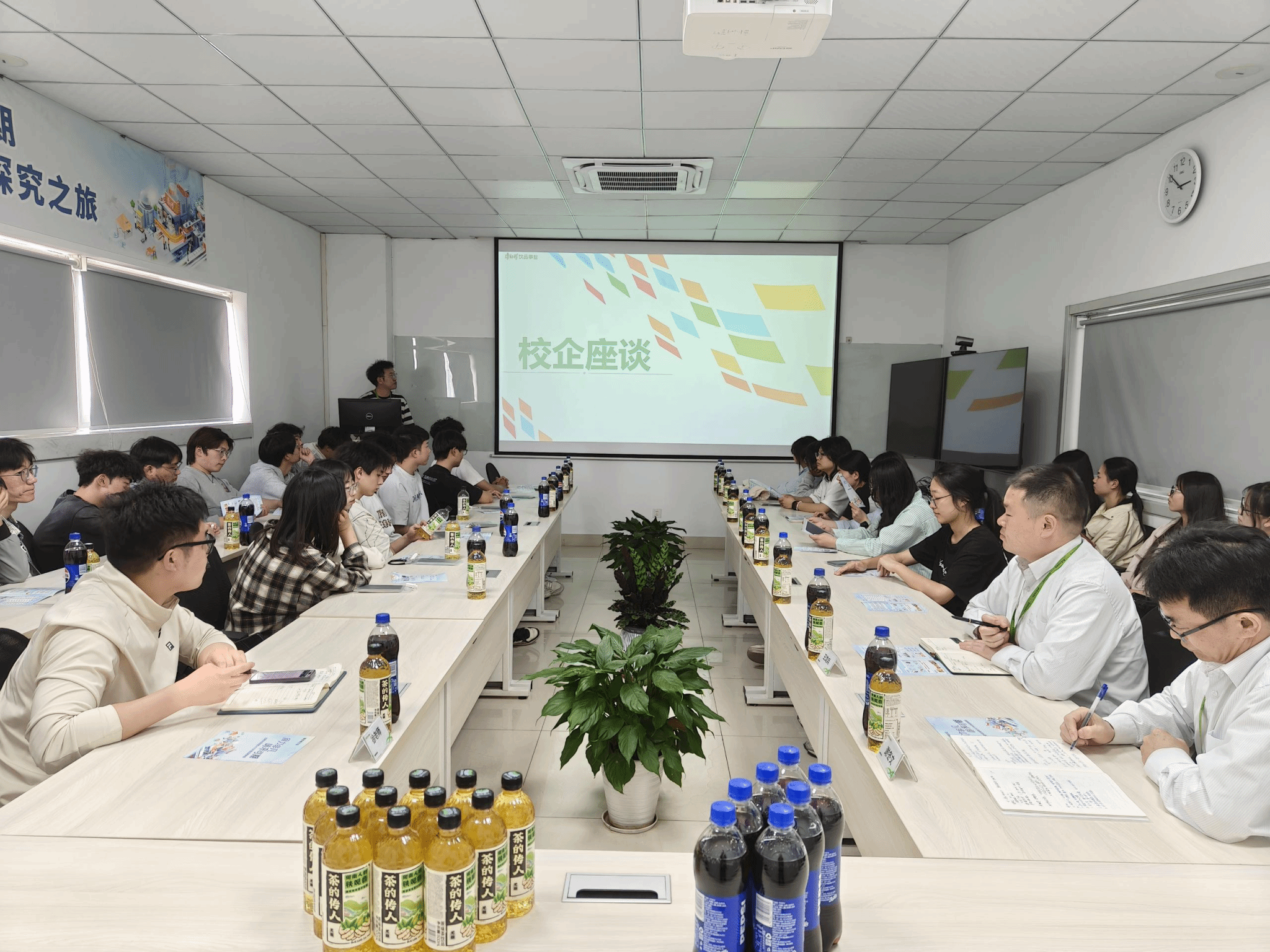 为进一步深化校企合作、拓宽毕业生就业渠道,推动应用型人才培养, 4月16日,生物与食品工程学院食品质量与安全党支部书记徐浩然带领30余名团学骨干赴康师傅控股旗下核心企业—合肥顶津食品有限公司开展校企学习交流活动。本次活动旨在搭建校企合作平台,探索产学研协同创新模式,助力学生职业发展。康师傅合肥顶津食品有限公司合肥品管处处长谢冬文、检验科科长王龙兵、校企招聘专员时义杰参加此次学习交流活动。
