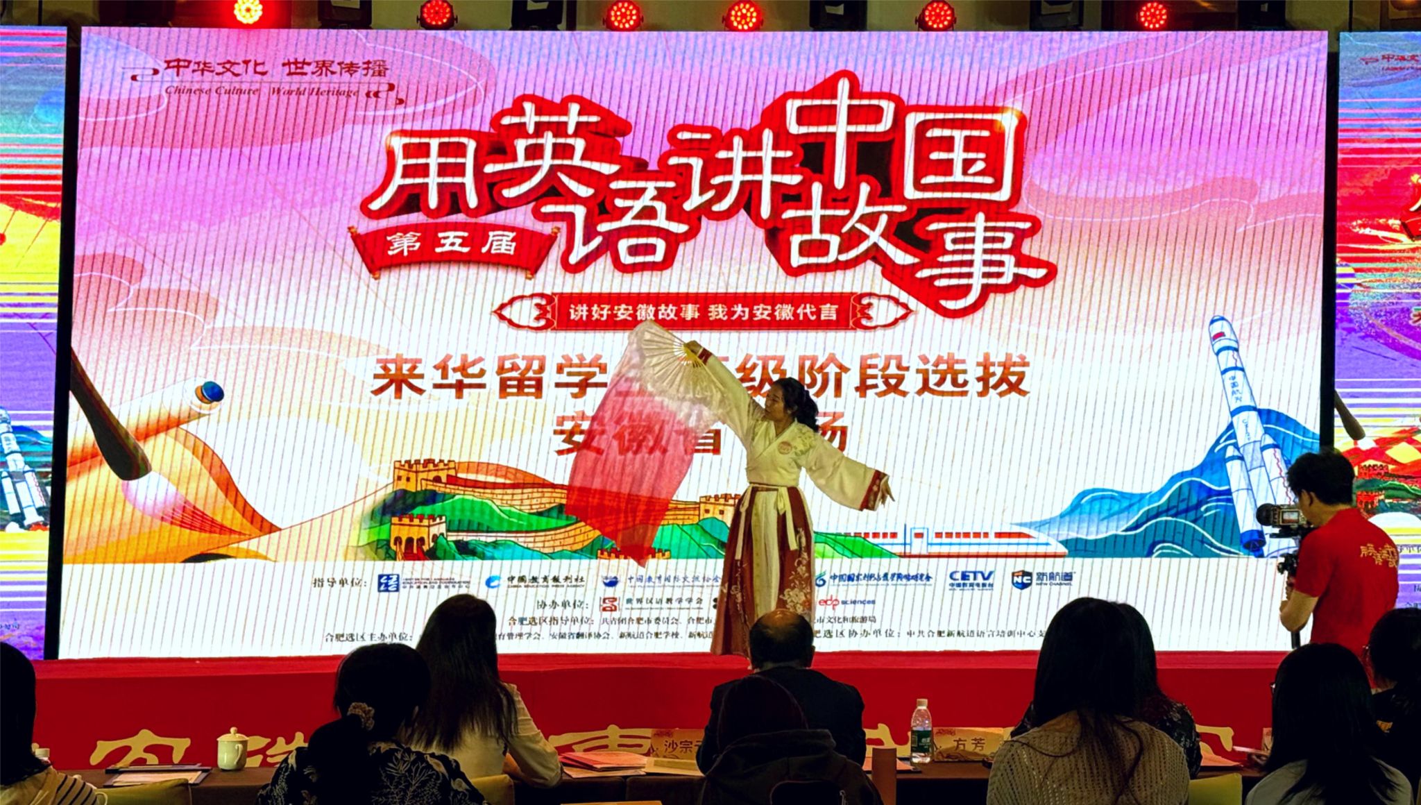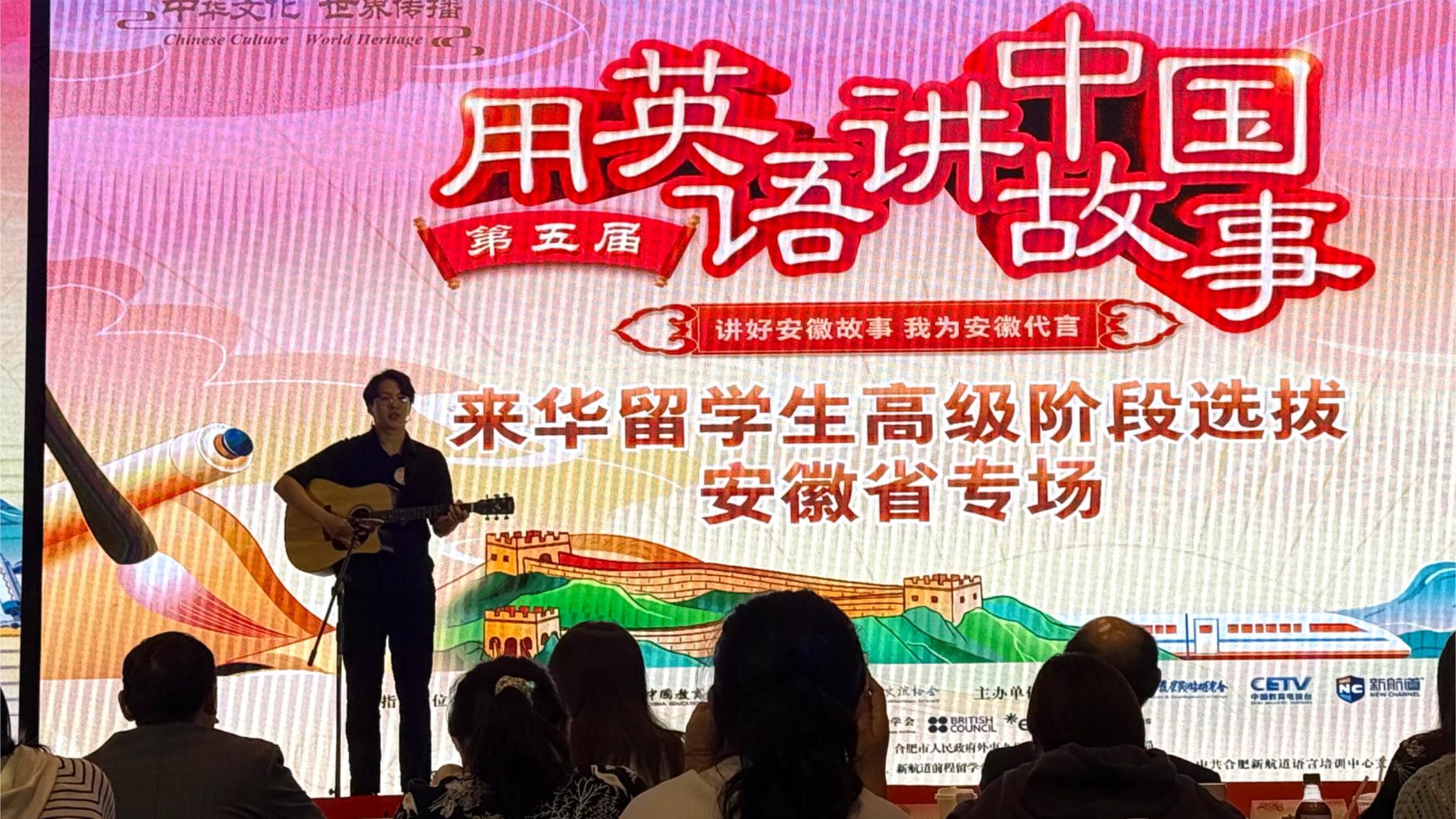 4月20日,第五届“用英语讲中国故事大会”来华留学生组高级阶段安徽省选拔专场在合肥举行,我院留学生洪泽帆、周丹玲通过初级阶段选拔,参与本次比赛。两位选手以“我从这里感知中国 属于我的中国故事”、“跨越山海的文化拥抱”为题,讲述了自己的中国故事,分别展示了中文歌吉他弹唱和中国扇子舞等才艺,表达了对中华文化的理解与热爱,最终获得优秀奖。