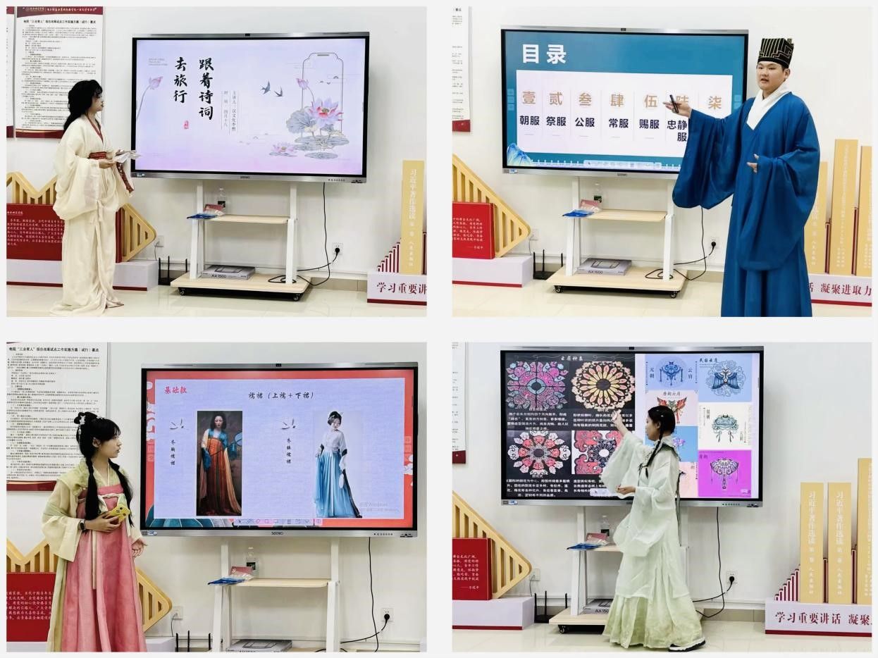 活动设置了经典诗词诵读展示、汉文化知识讲座等丰富多彩的内容。汉服社成员们精心挑选了《长安的荔枝》等经典篇章进行读书分享,他们字正腔圆、声情并茂的演绎,让在场师生仿佛置身于那个诗意纵横、风云激荡的时代,深切领略到古代文人的家国情怀与高尚品格。深入浅出的汉文化知识讲座,从汉服的起源与发展讲到汉代的礼仪制度,从诗词歌赋的韵味解析到古代哲学思想的内涵阐释,生动的讲解使同学们对汉文化有了更为全面、深刻的理解。