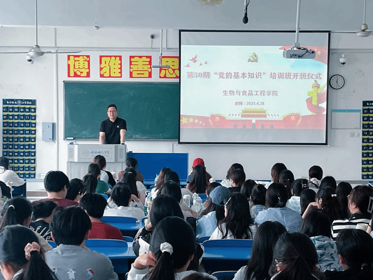 为进一步提升入党积极分子和发展对象的政治素养和理论水平,严把党员发展的“入口关”,4月28日,生物与食品工程学院分党校在逸夫楼202教室顺利举办“党的基本知识”培训班开班仪式。院党委书记、分党校校长马喆出席开班仪式并主讲党课第一讲,开班仪式由培训班班主任周其松主持,152名学员参加了开班仪式。