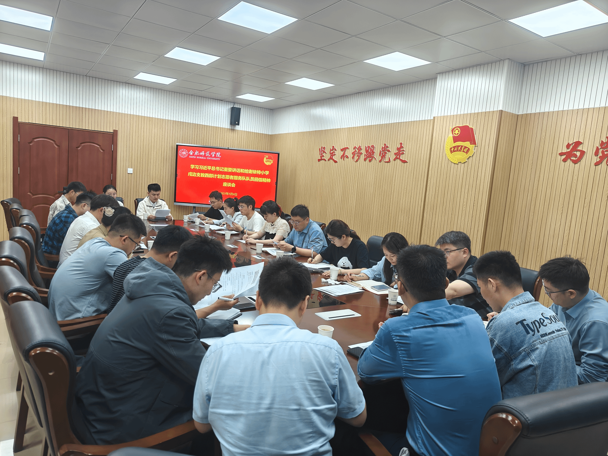 5月8日中午,院团委在锦绣校区共青之家会议室召开座谈会,学习贯彻习近平总书记重要讲话《激励新时代青年在中国式现代化建设中挺膺担当》和给谢依特小学戍边支教西部计划志愿者服务队队员重要回信精神,传达学习团中央《关于深入学习宣传贯彻习近平总书记重要讲话和给谢依特小学戍边支教西部计划志愿者服务队队员回信精神的通知》,研究部署学院共青团组织贯彻落实举措。院团委全体人员,各二级学院和团员青年代表参加会议。院团委书记刁文彬主持会议。