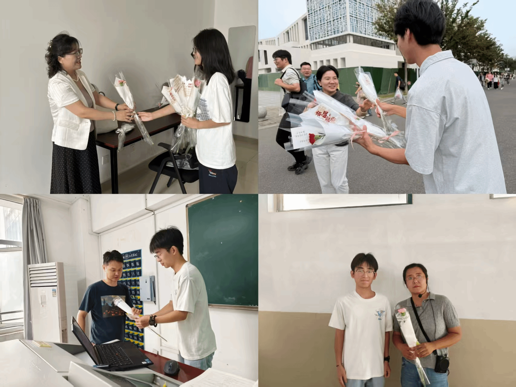 清晨伊始,院学生会的同学们便早早守候在校门、教学楼、办公室和食堂的主要通道旁。他们手持精心挑选的鲜艳花束,面带灿烂的笑容,等待着老师们的到来,将寓意着感恩、敬爱与祝福的鲜花郑重地送到老师手中。一束芬芳的鲜花,一句真挚的问候,凝聚着莘莘学子对老师深深的感激之情。送花结束后,同学们带着抹布、扫把等清洁工具,细致打扫了教师办公室的各个角落,为辛勤付出的老师们送上最真诚的祝福。