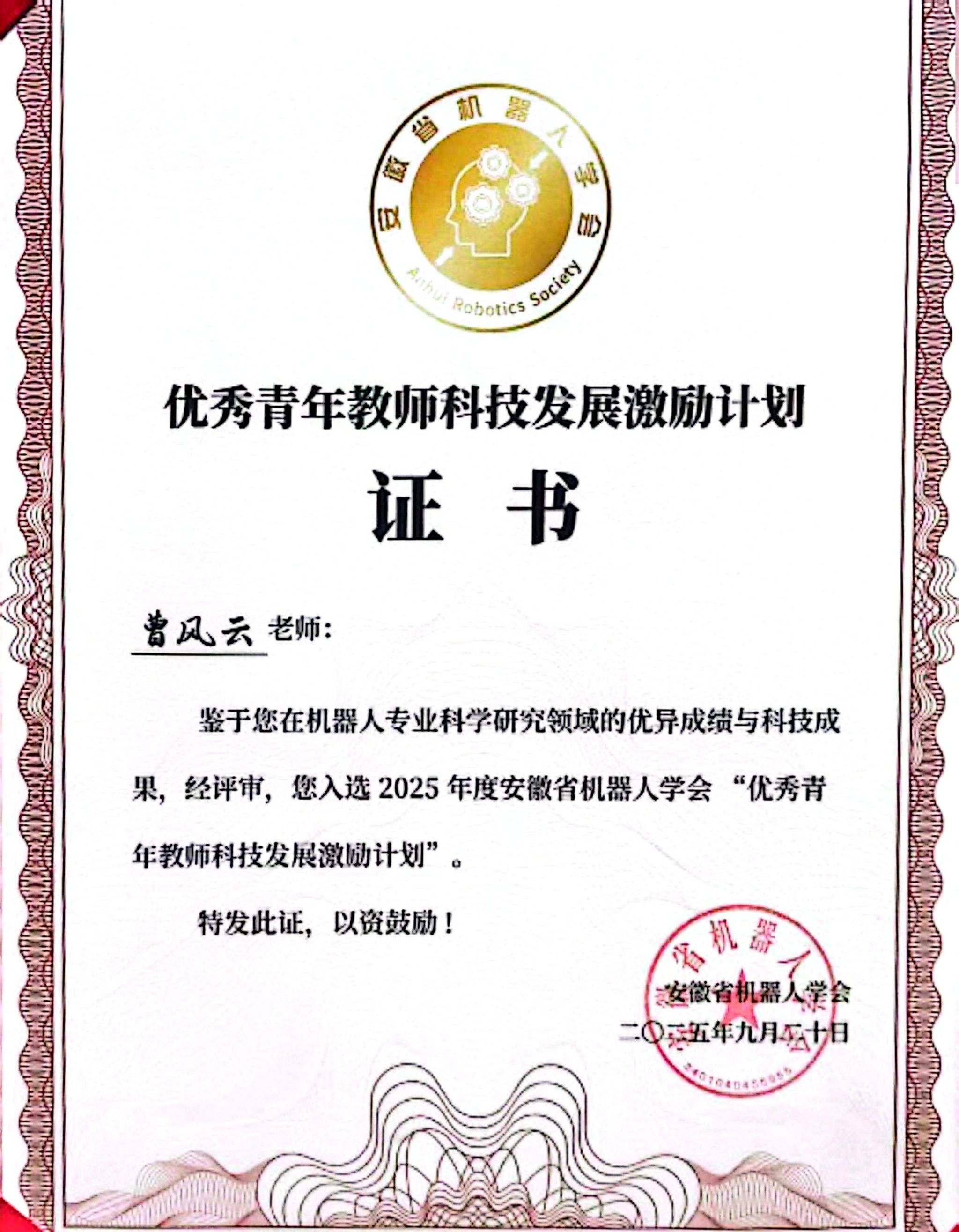 近日,第三届安徽省机器人大会暨智能机器人产业生态发展论坛在安徽工程大学召开,会上颁发了安徽省机器人学会2025年度奖励。计算机与人工智能学院曹风云老师荣获优秀青年教师发展激励计划奖励。