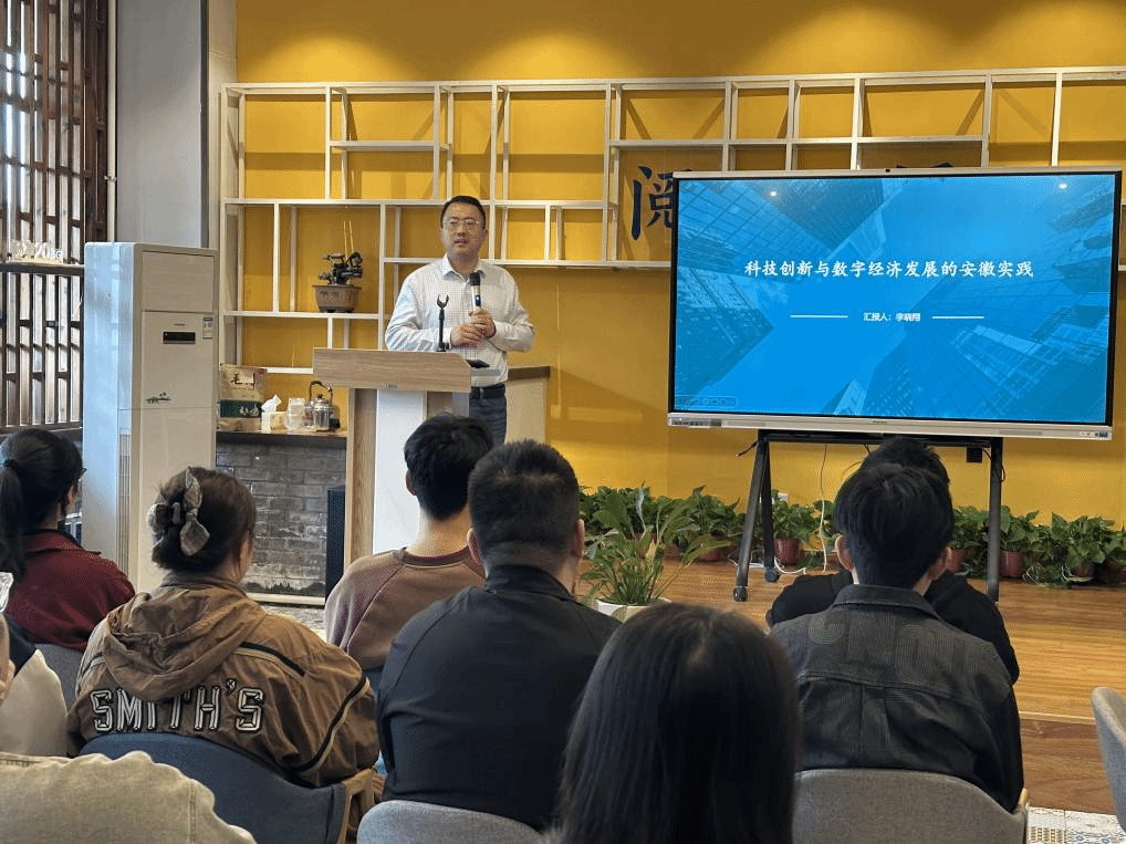 讲座伊始,李晓翔教授以党的二十大报告中 “科技是第一生产力” 等重要论述为开篇,为同学们搭建起理论认知框架。他结合安徽发展实际,层层剖析科技创新与高质量发展的内在关联,让同学们快速理解“为何创新是高质量发展的核心引擎”。并通过一组组“亮眼数据”与“硬核案例”详细介绍了安徽在数字经济、数字政府、数字社会等领域的实践,让同学们直观看到数字化转型带来的便捷与效益,并深刻感受到科技创新不仅是实验室里的突破,更是推动区域经济腾飞的 “现实力量”。