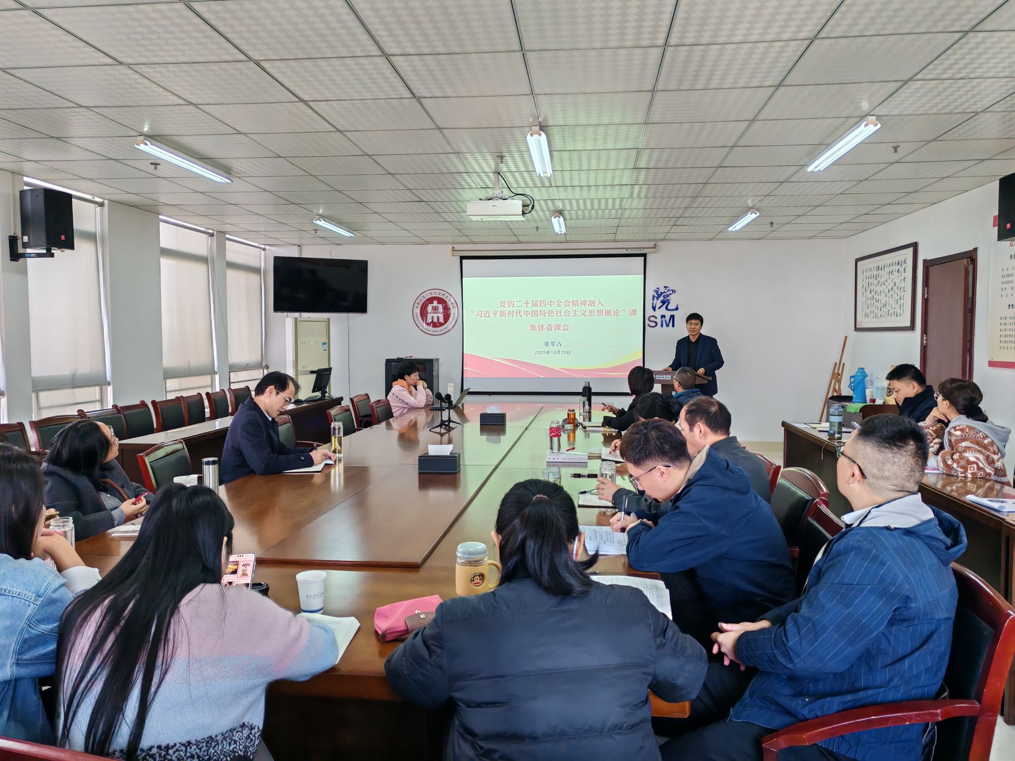 与会教师首先集体学习了党的二十届四中全会公报全文,深入研读了全会提出的新思想、新论断、新部署。备课会主讲人“习近平新时代中国特色社会主义思想概论”课程教研室主任张军占副教授重点围绕党的二十届四中全会精神解读、融入思政课的基本原则及教学重点做了细致讲解,为党的二十届四中全会精神有效融入思政课教学做出辅导与示范。