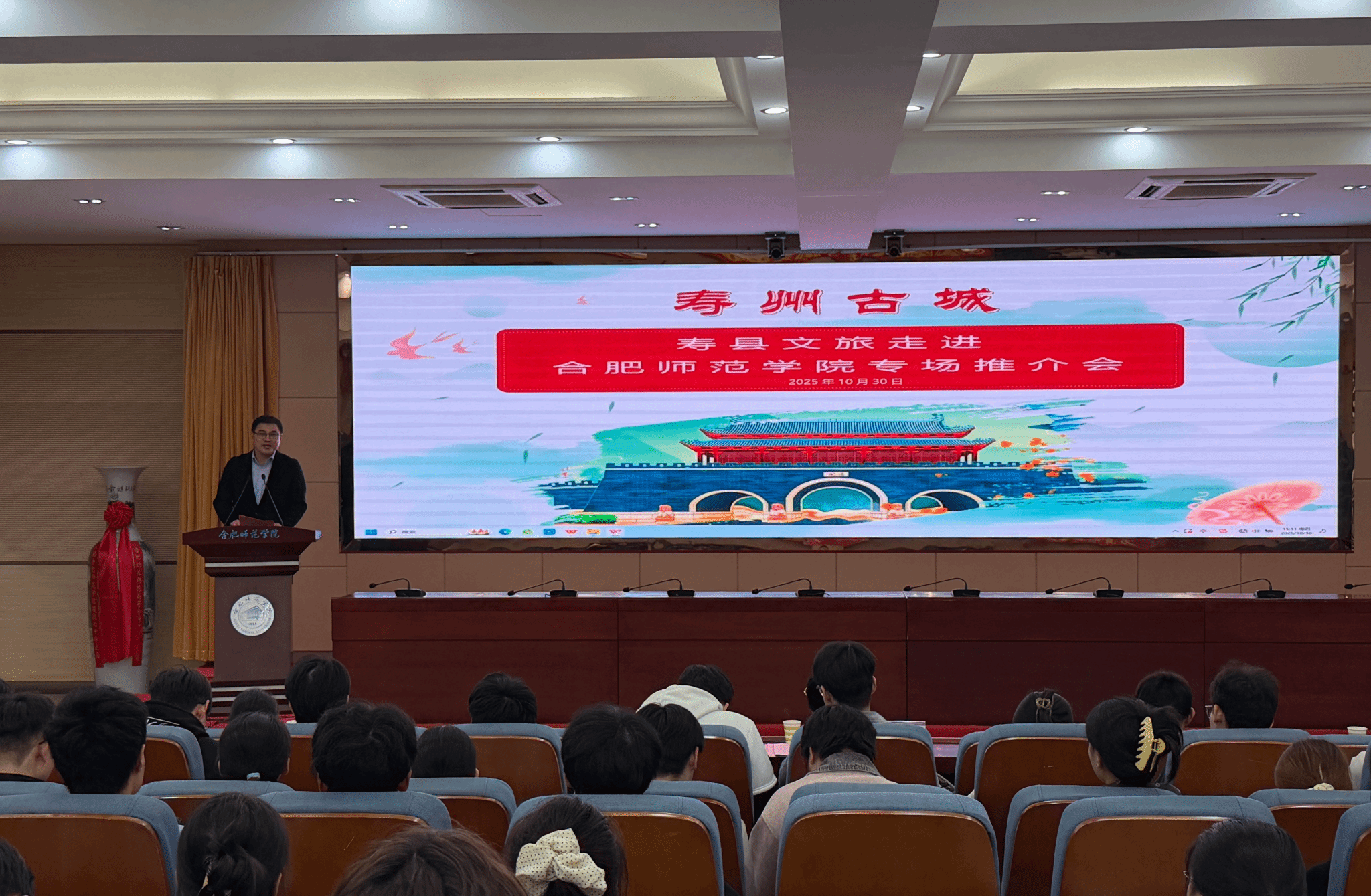 10月30日,学院于学术报告厅举办“下一站·寿县”文化旅游推介活动,以多元形式搭建校地文旅交流桥梁,让学院师生沉浸式感受寿县千年文化魅力。寿县副县长王素苗,院党委委员、副院长周端明及相关部门负责人参加本次活动。