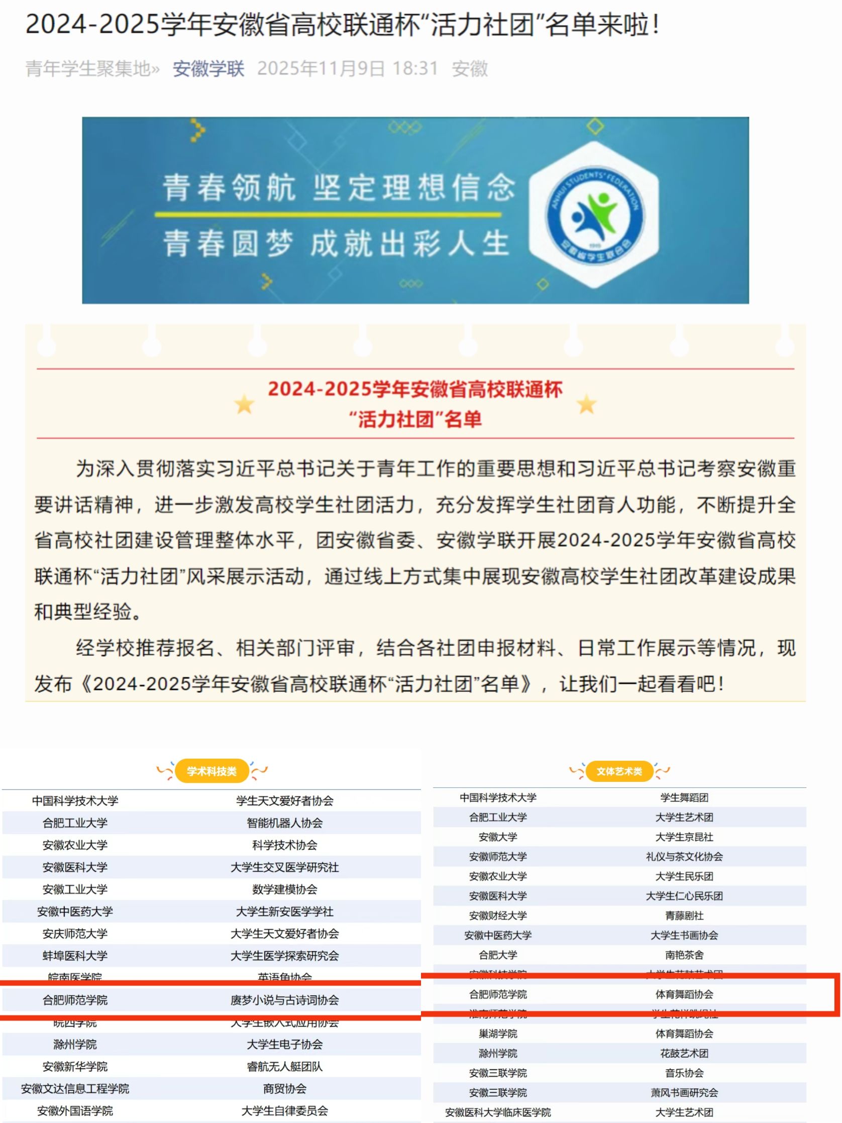 近日,共青团安徽省委员会、安徽省学生联合会正式发布《2024-2025学年安徽省高校联通杯“活力社团”名单》,学院赓梦小说与古诗词协会(学术科技类)和体育舞蹈协会(文体艺术类)双双入选,展现了我院学生社团建设的丰硕成果与独特风采。