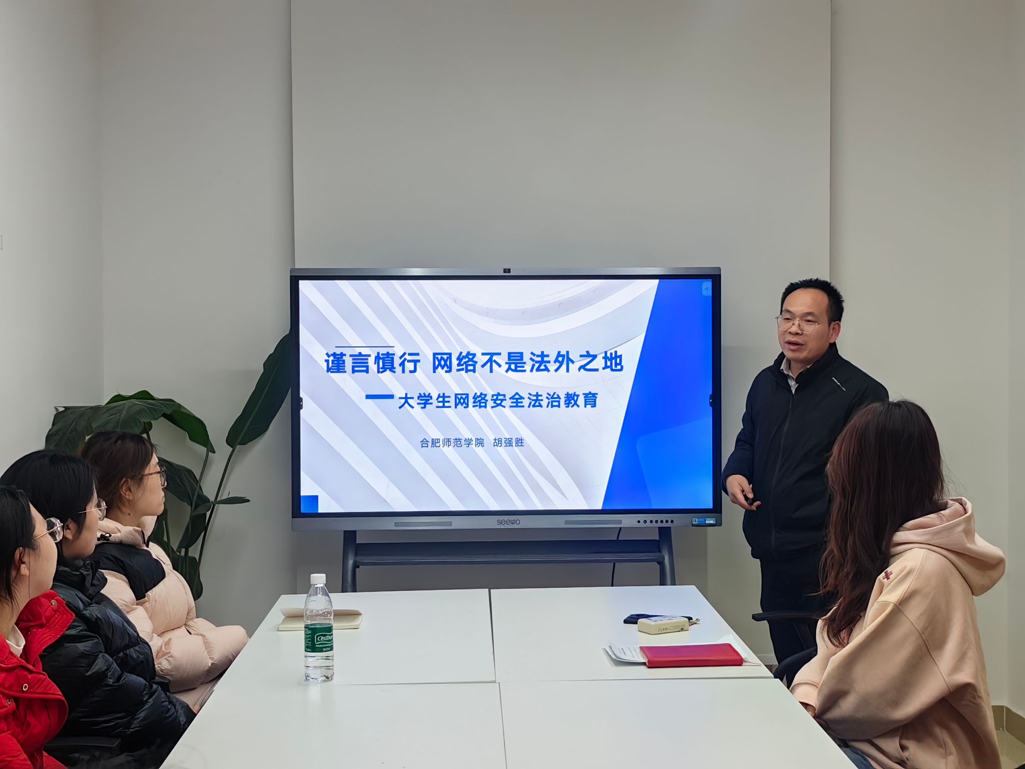 在第十二个国家宪法日即将到来之际,为深入贯彻习近平法治思想,强化青年学子的宪法意识与网络安全素养,12月3日,文学院在滨湖校区集萃文苑一站式学生社区举行国家宪法日专题学习教育活动暨网络安全专题普法讲座,活动邀请校党政办公室法治科胡强胜主讲,文学院团委书记李惠恩主持。此次活动由文学院团委和文学院学生党支部联合举办,将宪法精神普及与网络安全教育进行深度融合,旨在引导青年学子尊崇法律、学习法律、遵守法律、运用法律。