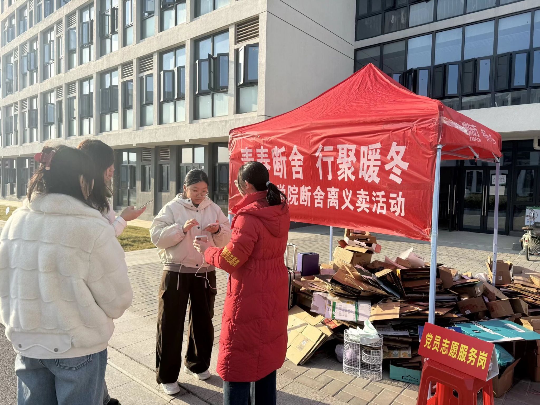 活动现场,“党员志愿服务岗”的红色标识格外醒目。学生党员和志愿者身穿冬装,佩戴袖标,在一个个帐篷下忙碌布置义卖摊位。帐篷悬挂着“青春断舍 行聚暖冬”的醒目标语,摊位上分类摆放着同学们捐赠的书籍、衣物、文具等闲置物品。党员志愿者带头整理物资、登记造册,用实际行动践行服务初心,成为寒冬中一抹温暖的色彩。