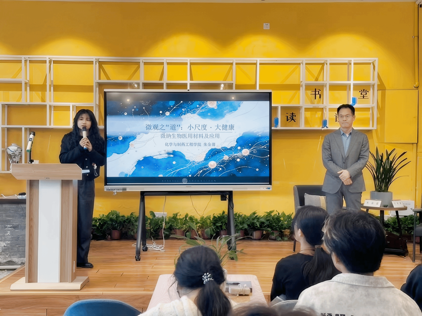 4月8日,锦绣校区“阅+历”读书讲堂科创系列第三期如期举办,本次讲座以“小尺度·大健康 —— 微纳生物医用材料及应用”为主题,由化学与制药工程学院院长朱金苗教授主讲,校阅读推广人、经济与管理学院万诗婕老师主持。