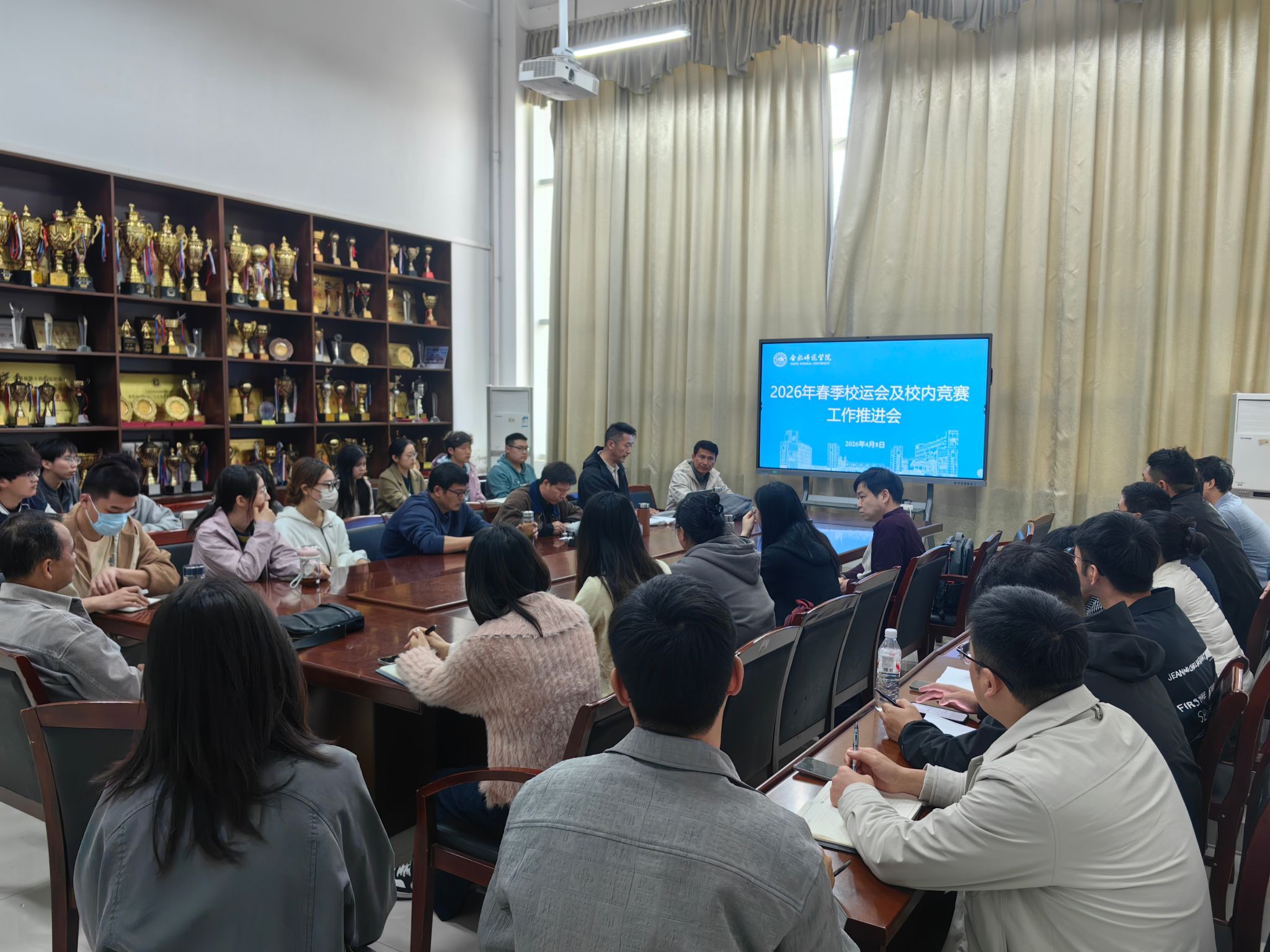 为扎实推进2026年春季校运会及校内各项体育竞赛筹备工作,进一步明确任务分工、细化工作流程,确保赛事安全、规范、有序开展,4月8日中午,在锦绣校区体育馆会议室召开2026年春季校运会及校内竞赛工作推进会。各二级学院团委书记及学生体育部负责人参加会议,共同研究部署相关筹备事宜。